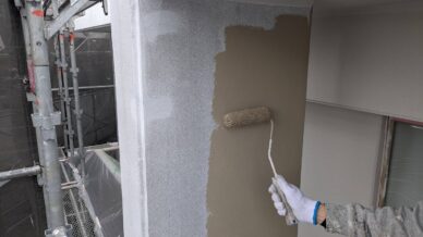 塗装工事B棟6号室~8号室バルコニーの下塗り塗装、中塗り塗装、補修後の肌合わせ塗装をしました。外壁補修した壁を周りの壁の肌感のように凹凸のあるざらざらした肌感に専用のローラーで肌合わせをしました。防水...