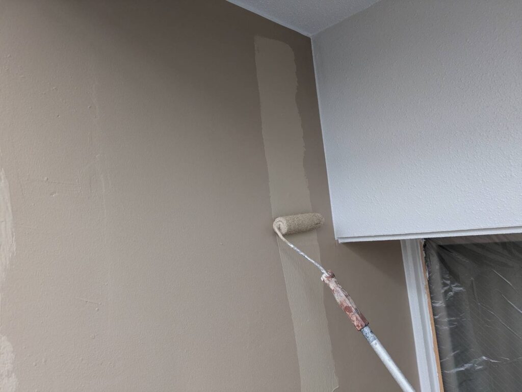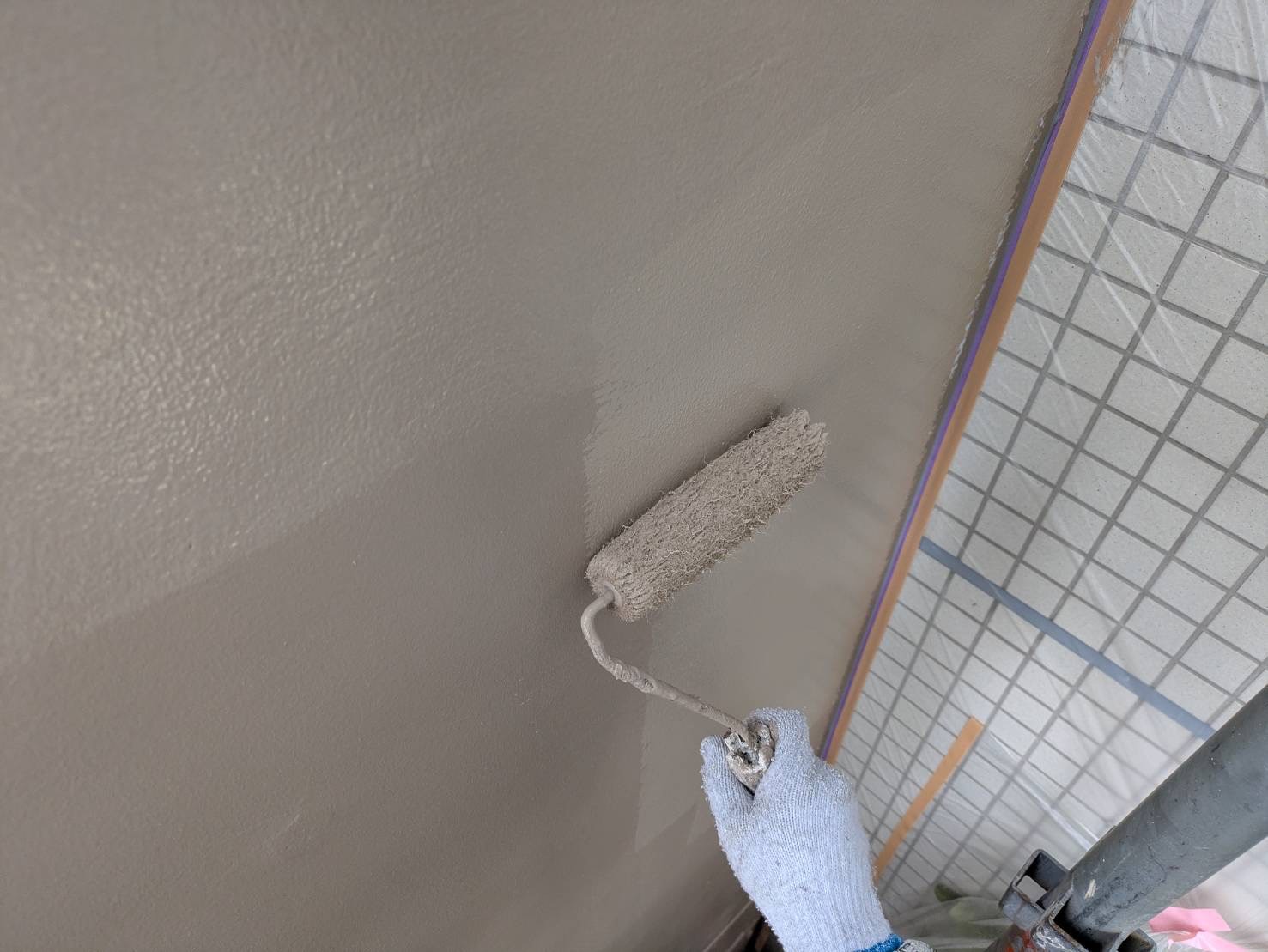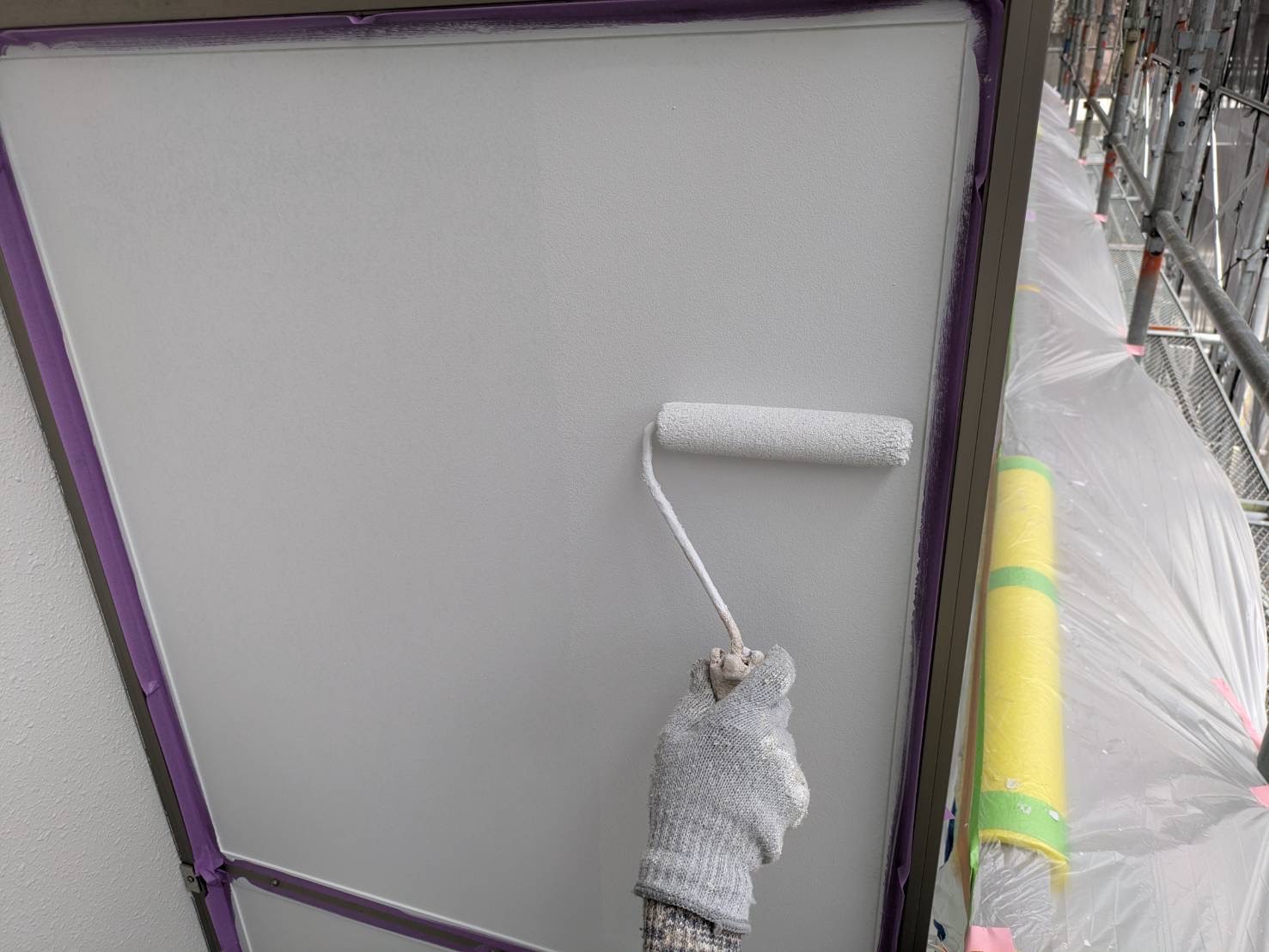 A棟バルコニーの内壁の上塗り、パーテーション(隔て板)の二回目塗装をしました。