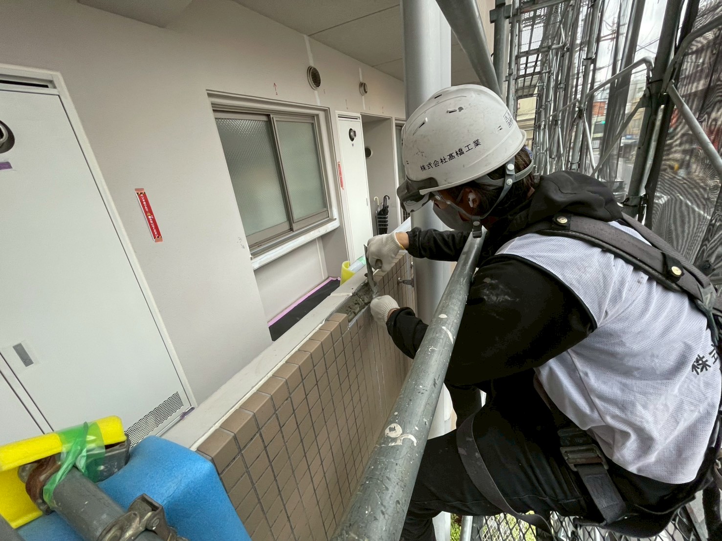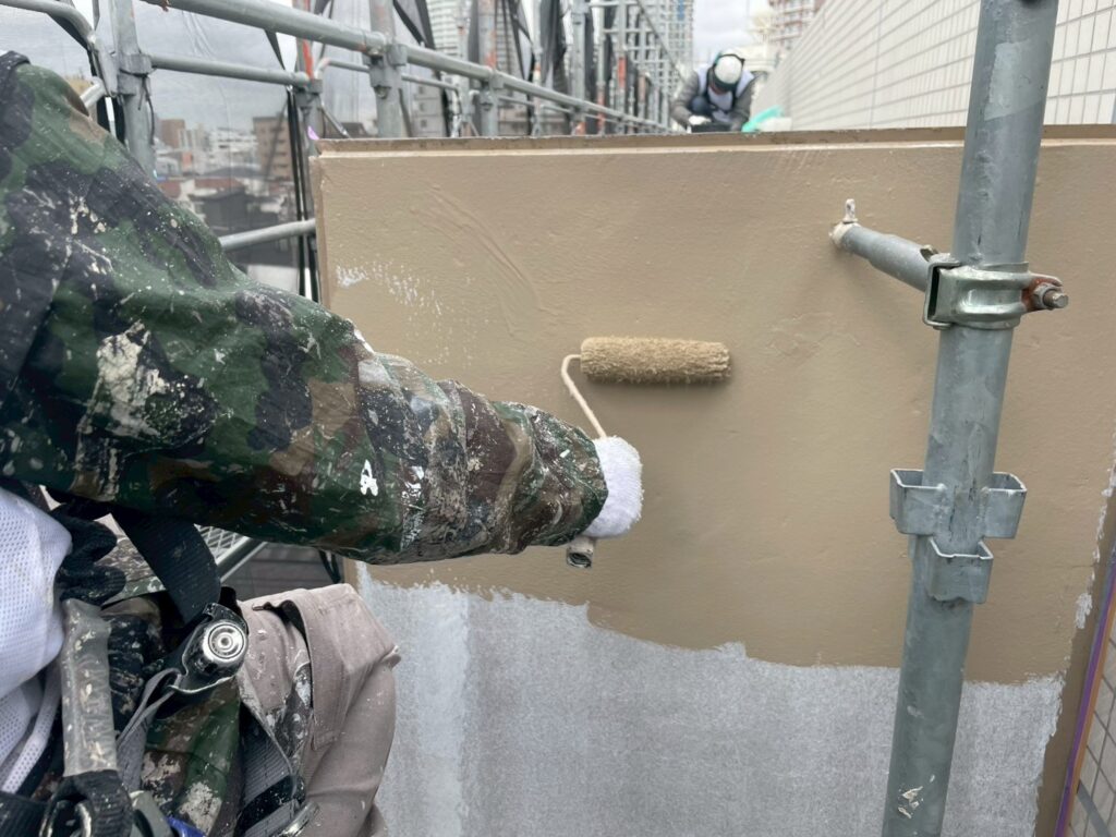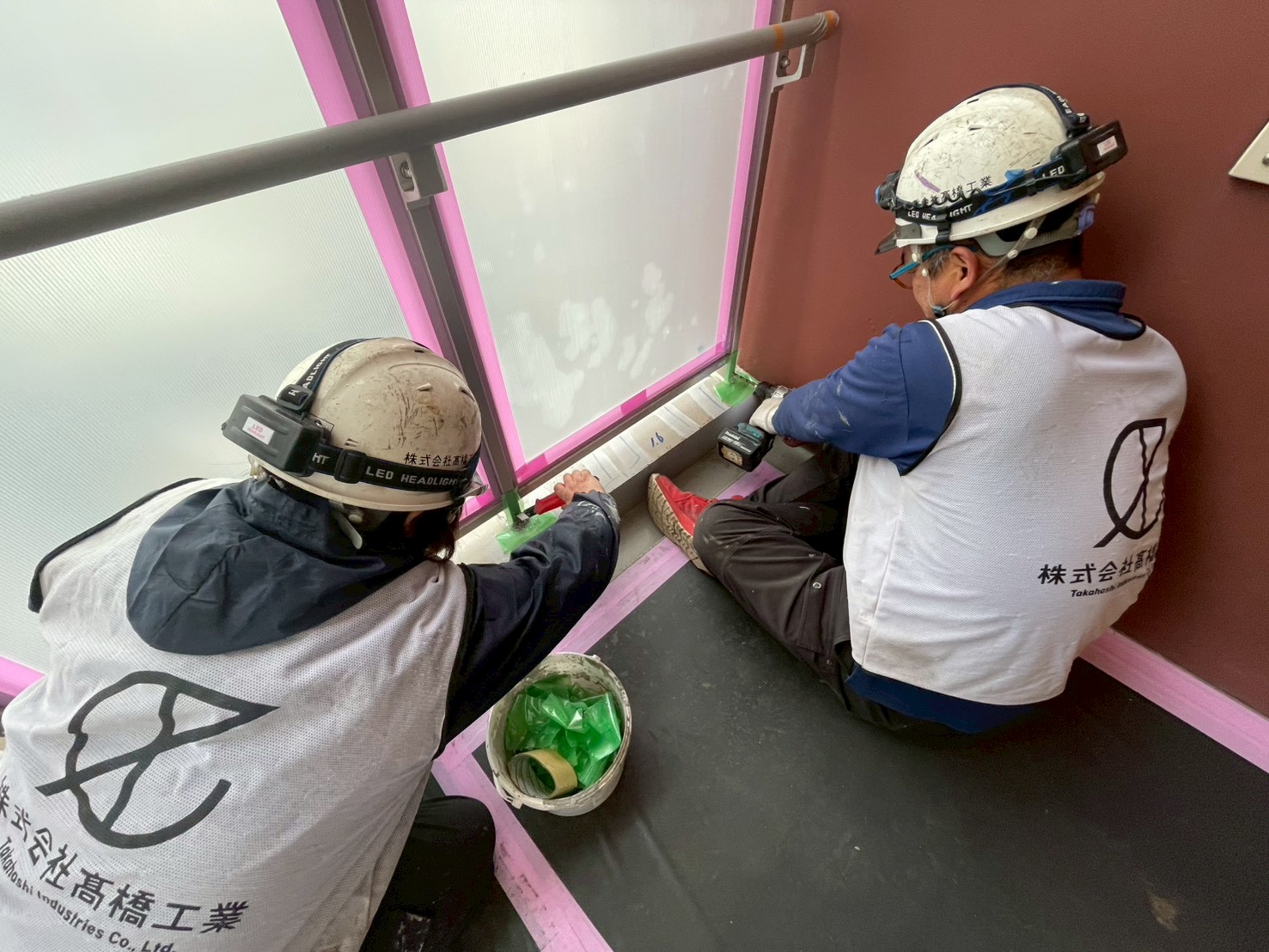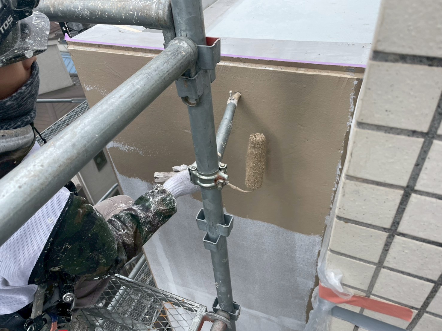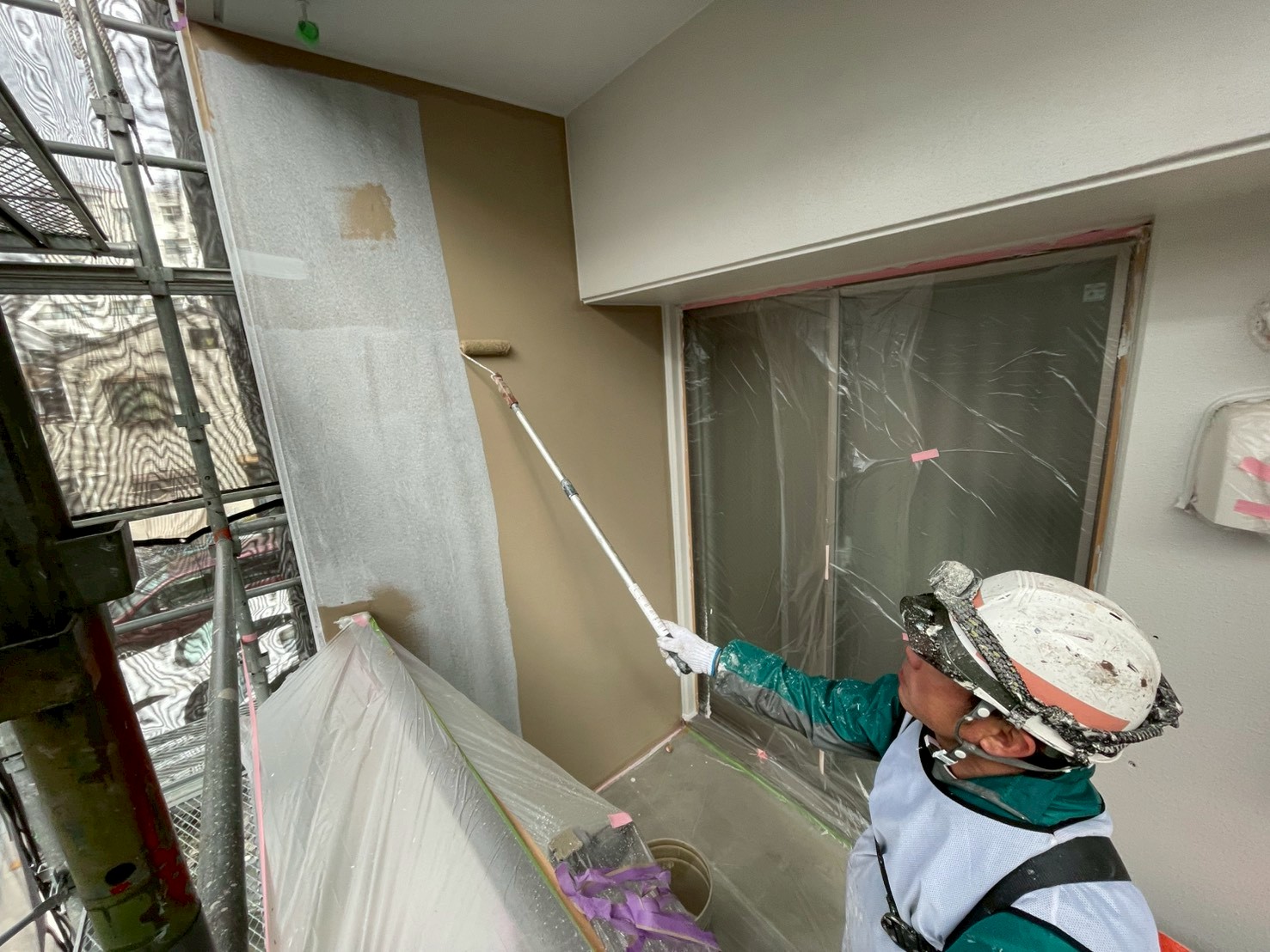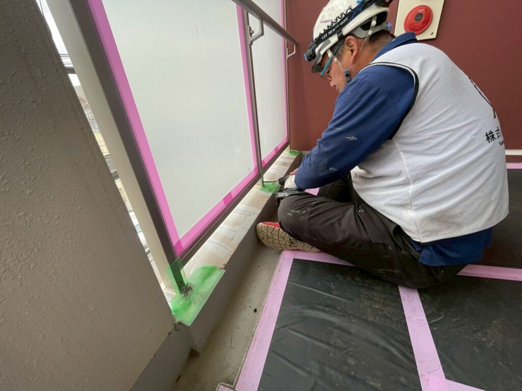 A棟バルコニー面の外壁、内壁の中塗り塗装をおこない、A棟バルコニーの養生を剥がしました。
