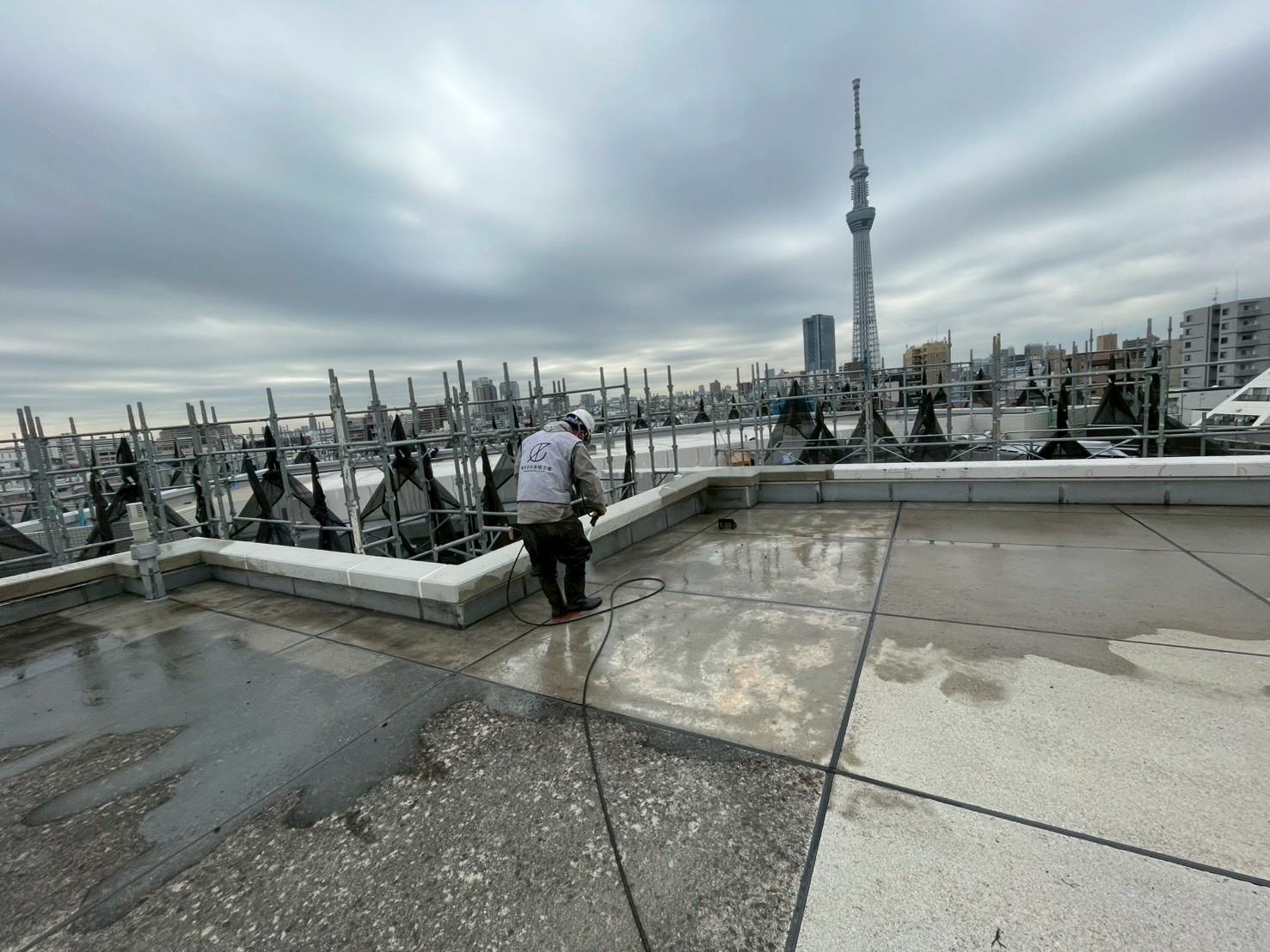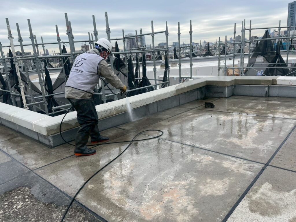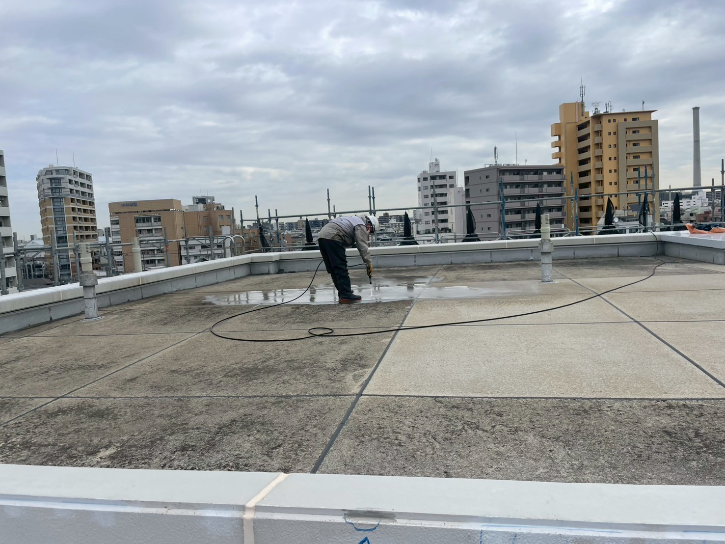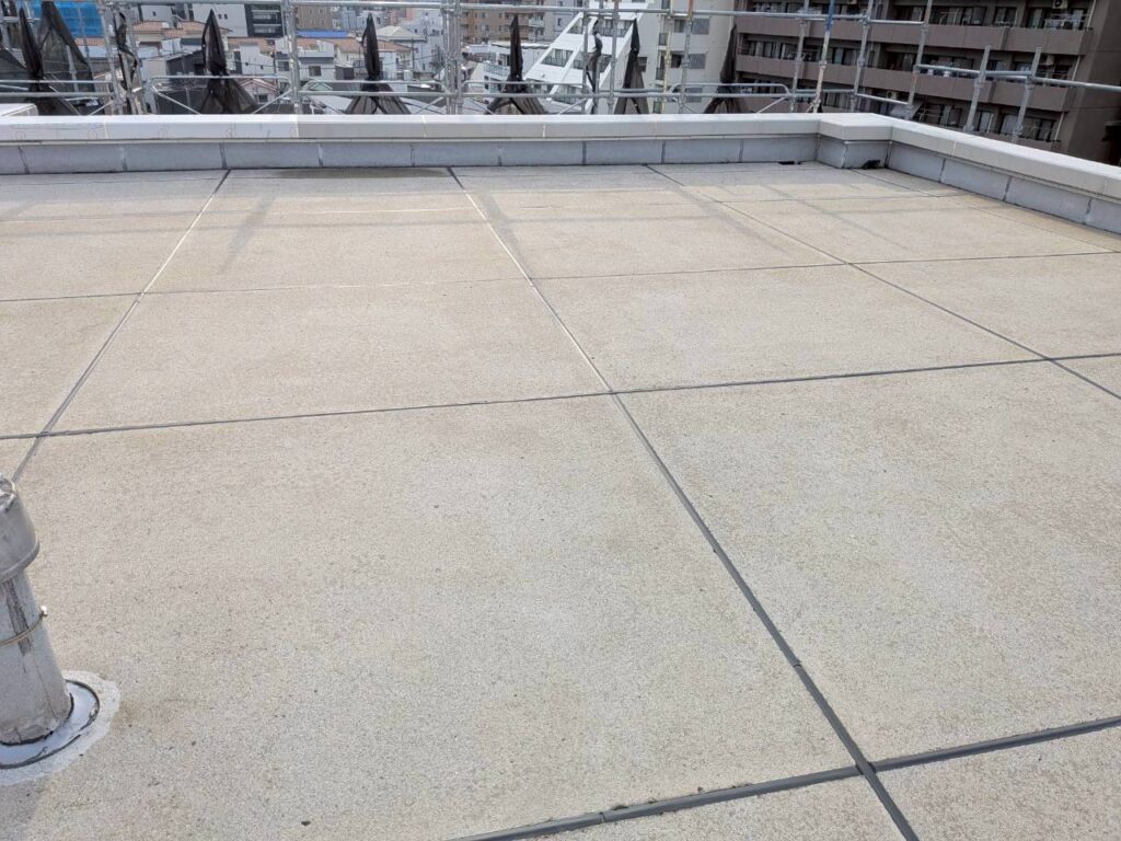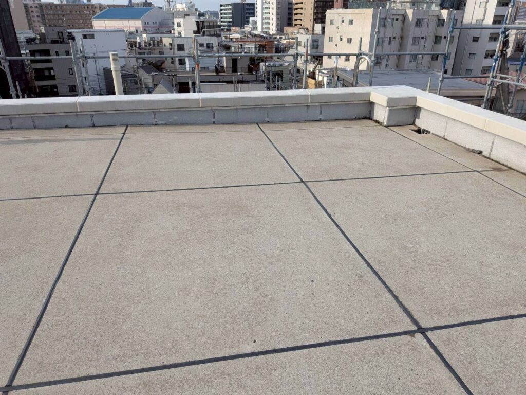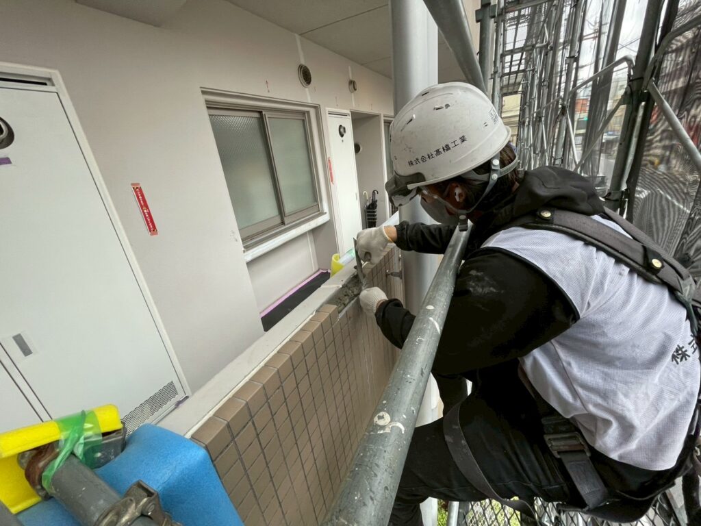 A棟バルコニー面の外壁、内壁の中塗り塗装をおこない、A棟バルコニーの養生を剥がしました。