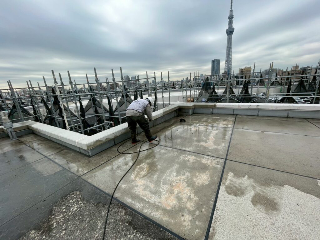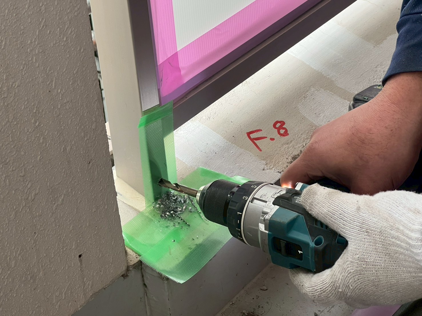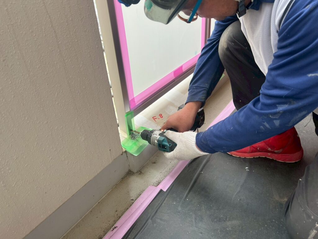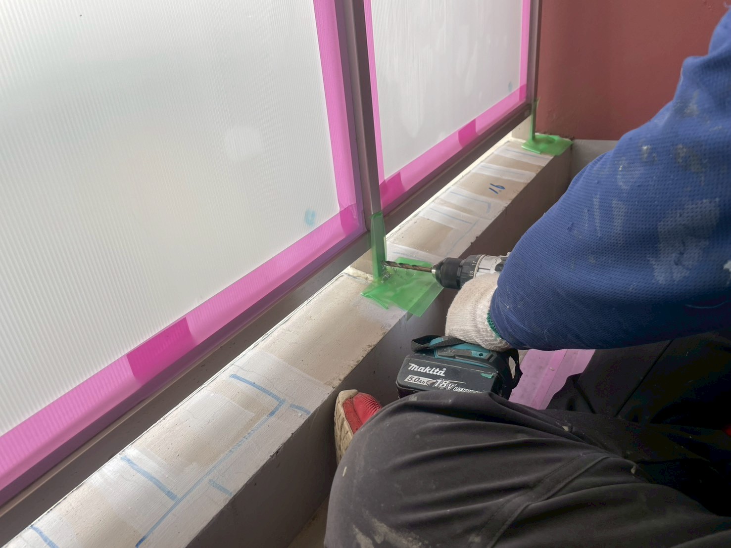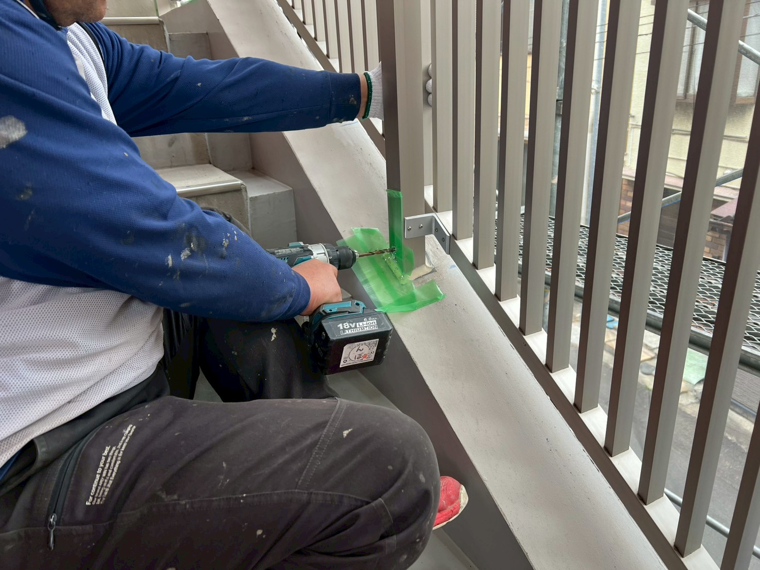 ドリルで手摺に穴をあけ止水材(グラウド材)を注入します。