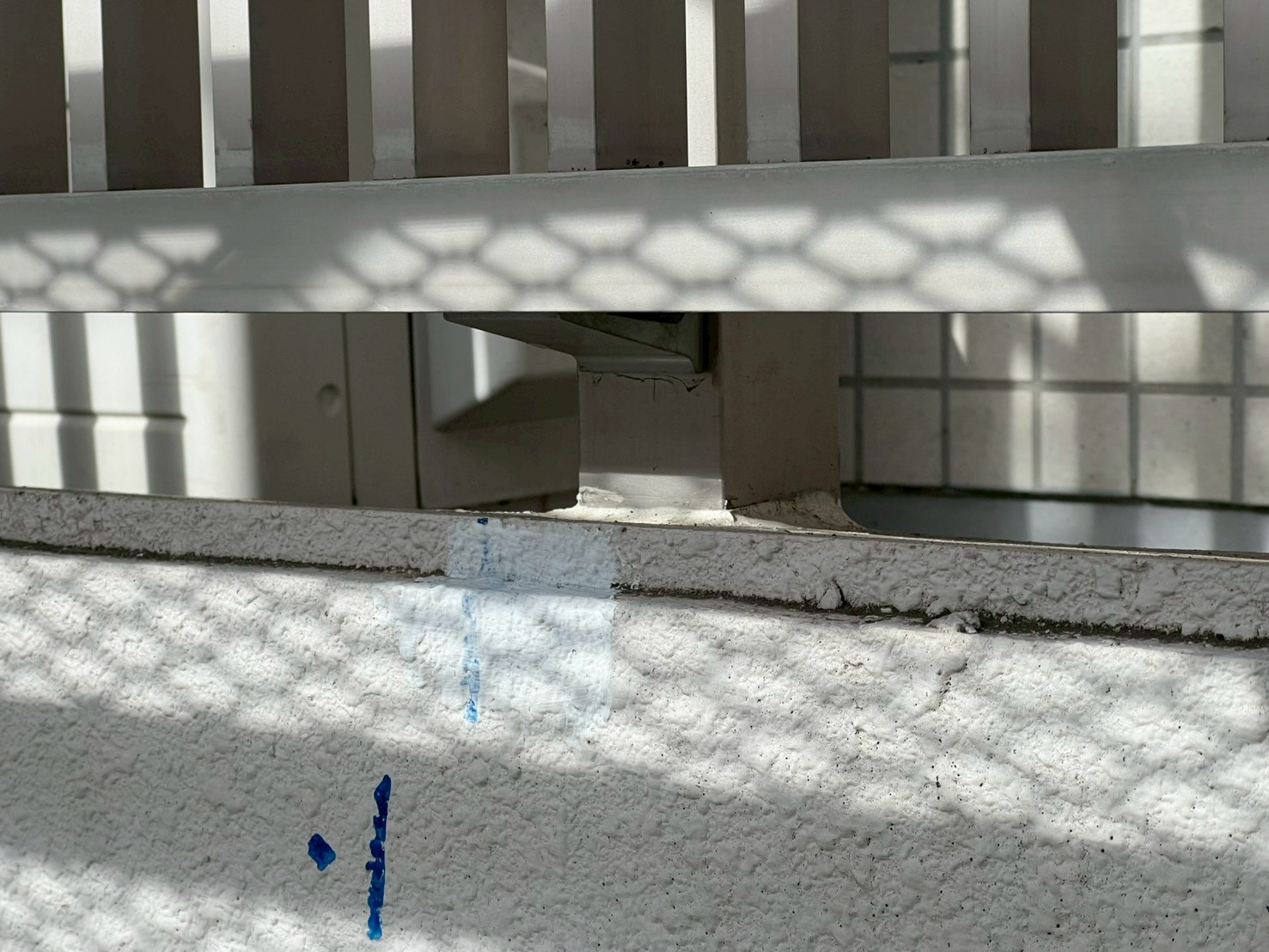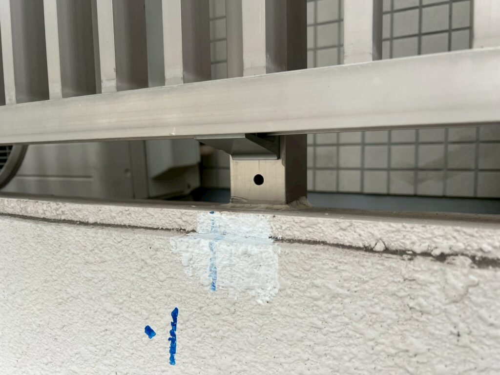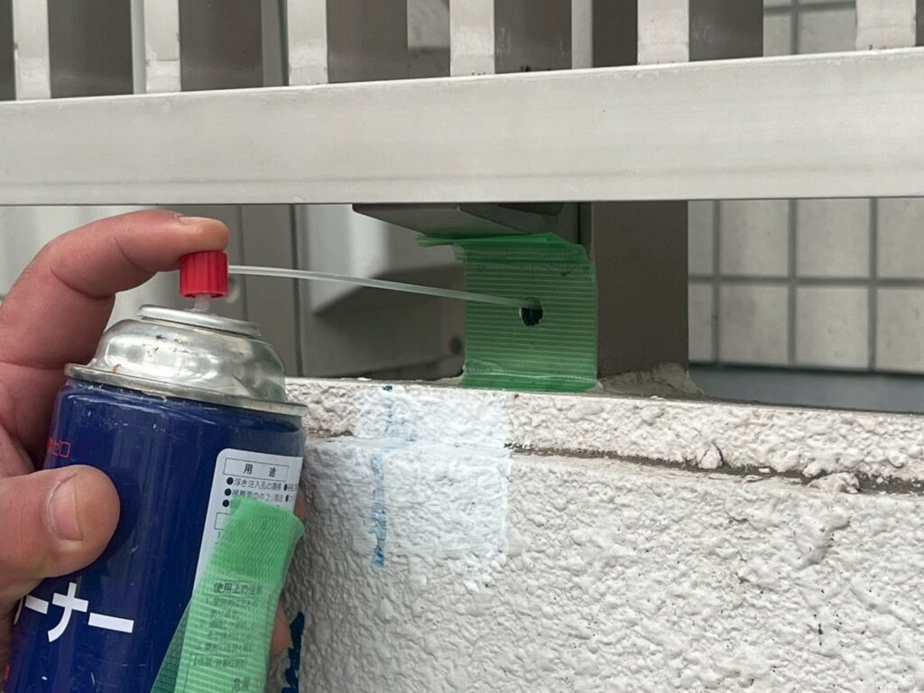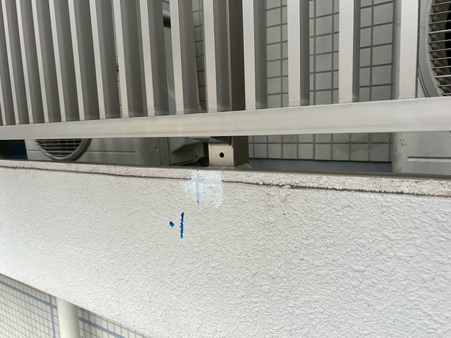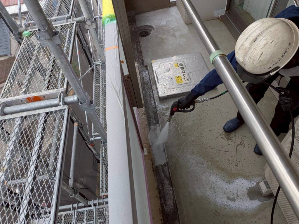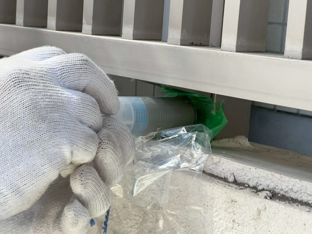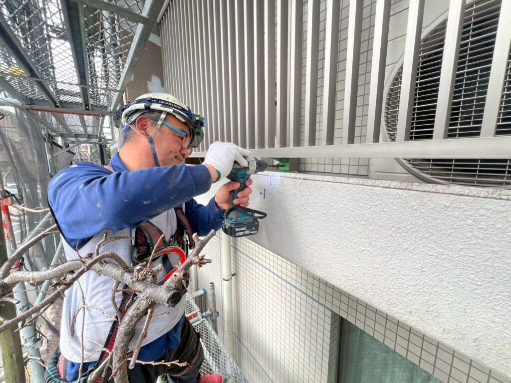 3月10日 (火) 作業状況 2026.03.11 目次 止水工事洗浄工事3月11日 (水) 予定 止水工事 手摺根本の止水工事 バルコニー等の手摺の支柱にドリルで穴をあけ止水材(グラウド材)を充填し、万が一手摺内に雨水が入っても穴から雨水が出て支柱から躯体に雨が侵入するの防ぐ工事になります。 止水材は硬化するとカチカチまで固くなる止水材料になります。 洗浄工事 B棟6号室~8号室のバルコニー、サービスバルコニーの洗浄をしました。 洗浄後は塗装工事→防水工事→長尺工事の順に作業が進んでいきます。 3月11日 (水) 予定 ・タイル洗浄工事 ・止水工事 ・防水工事 ・塗装工事