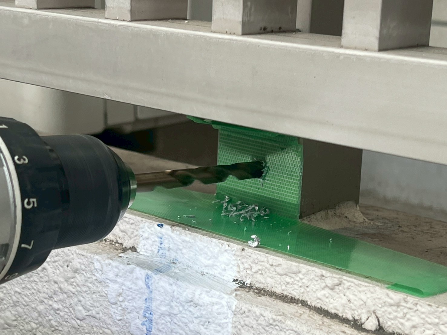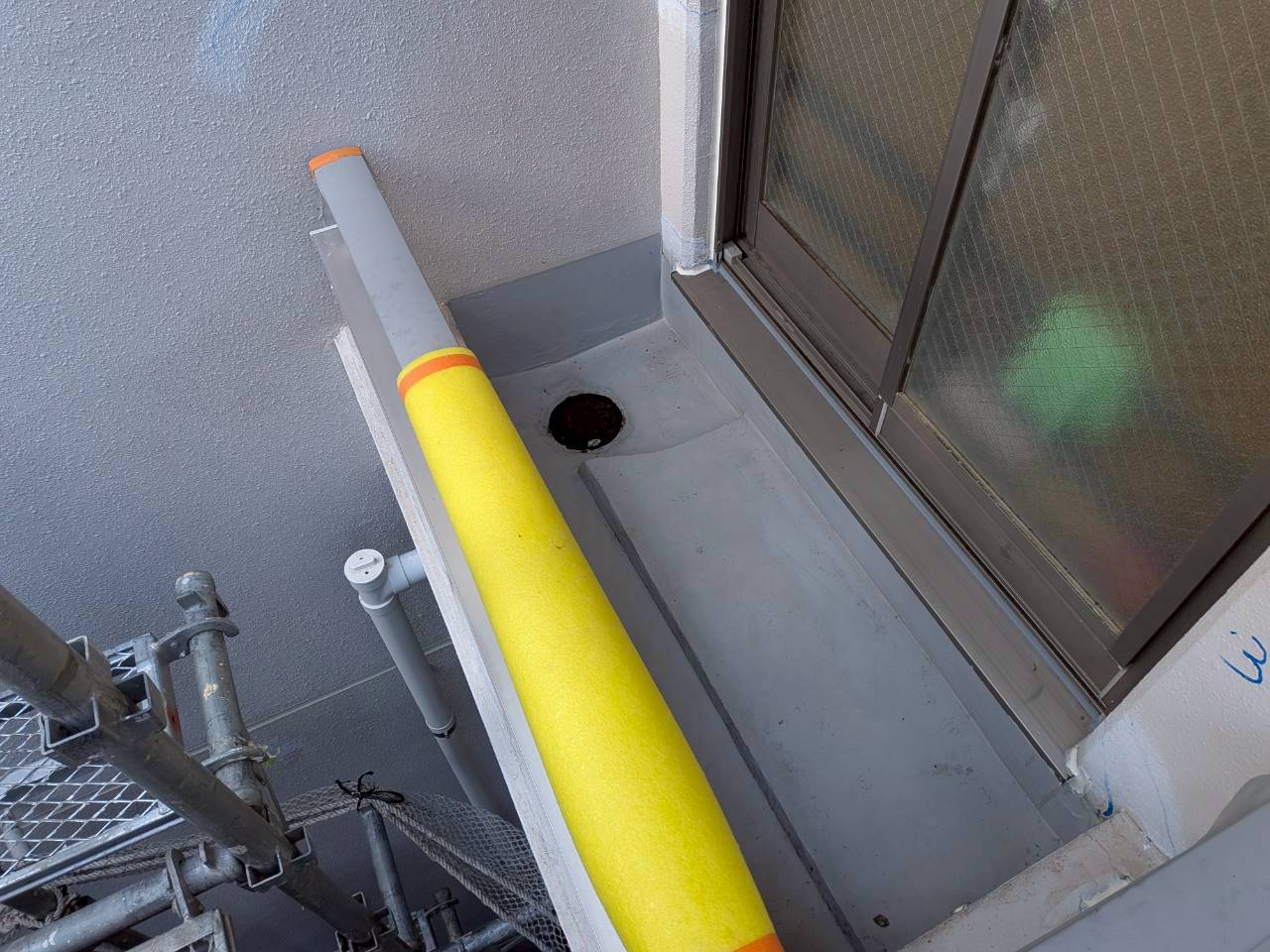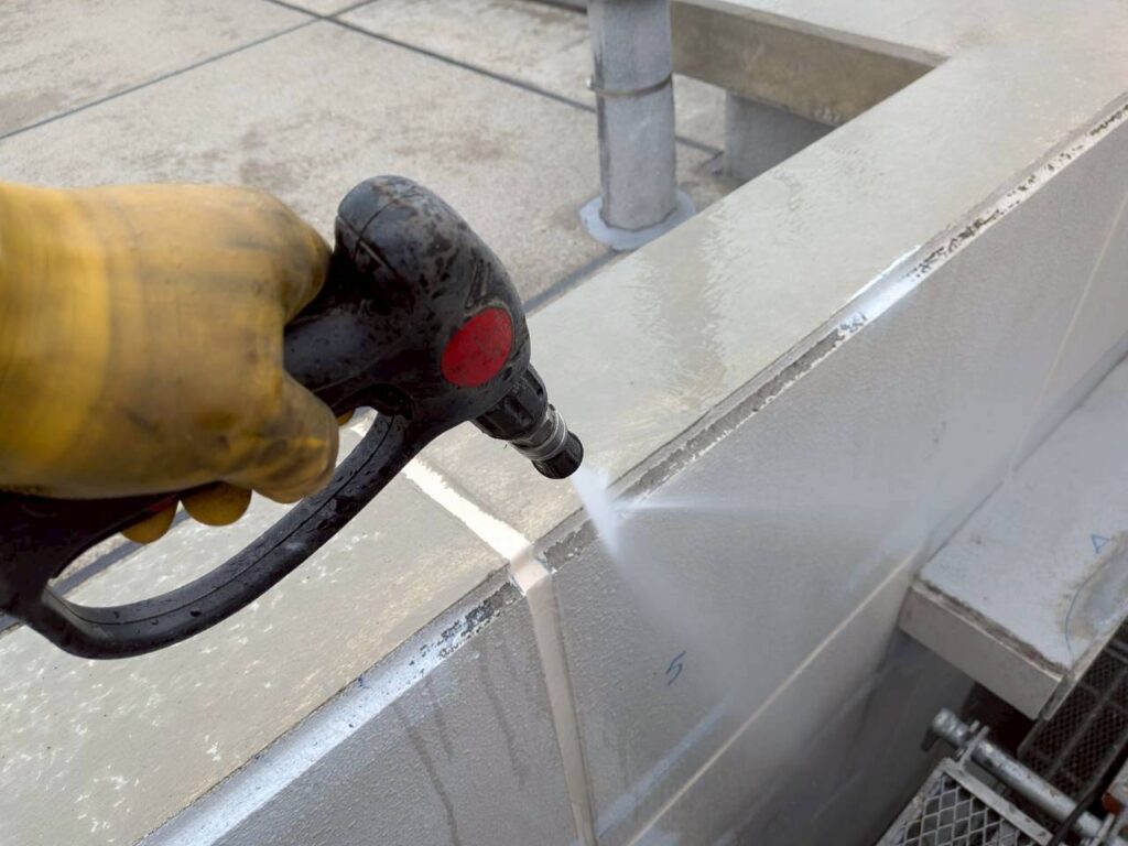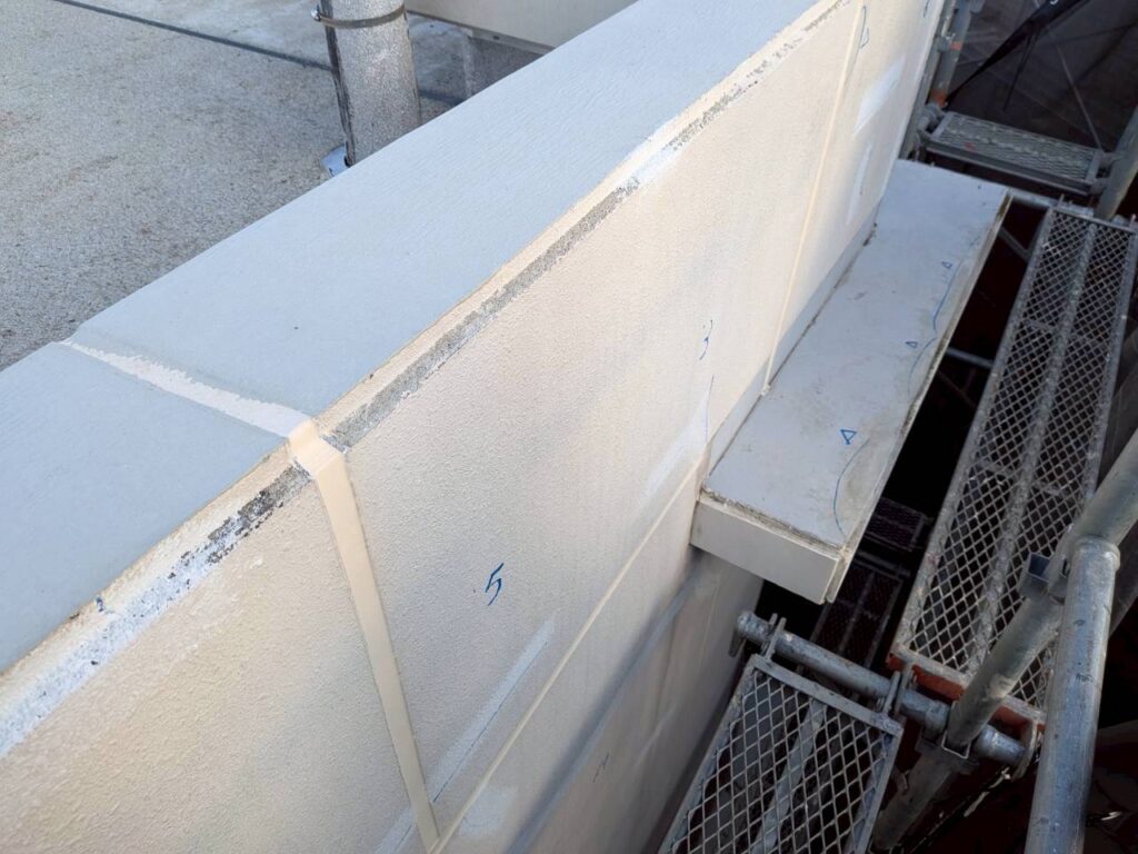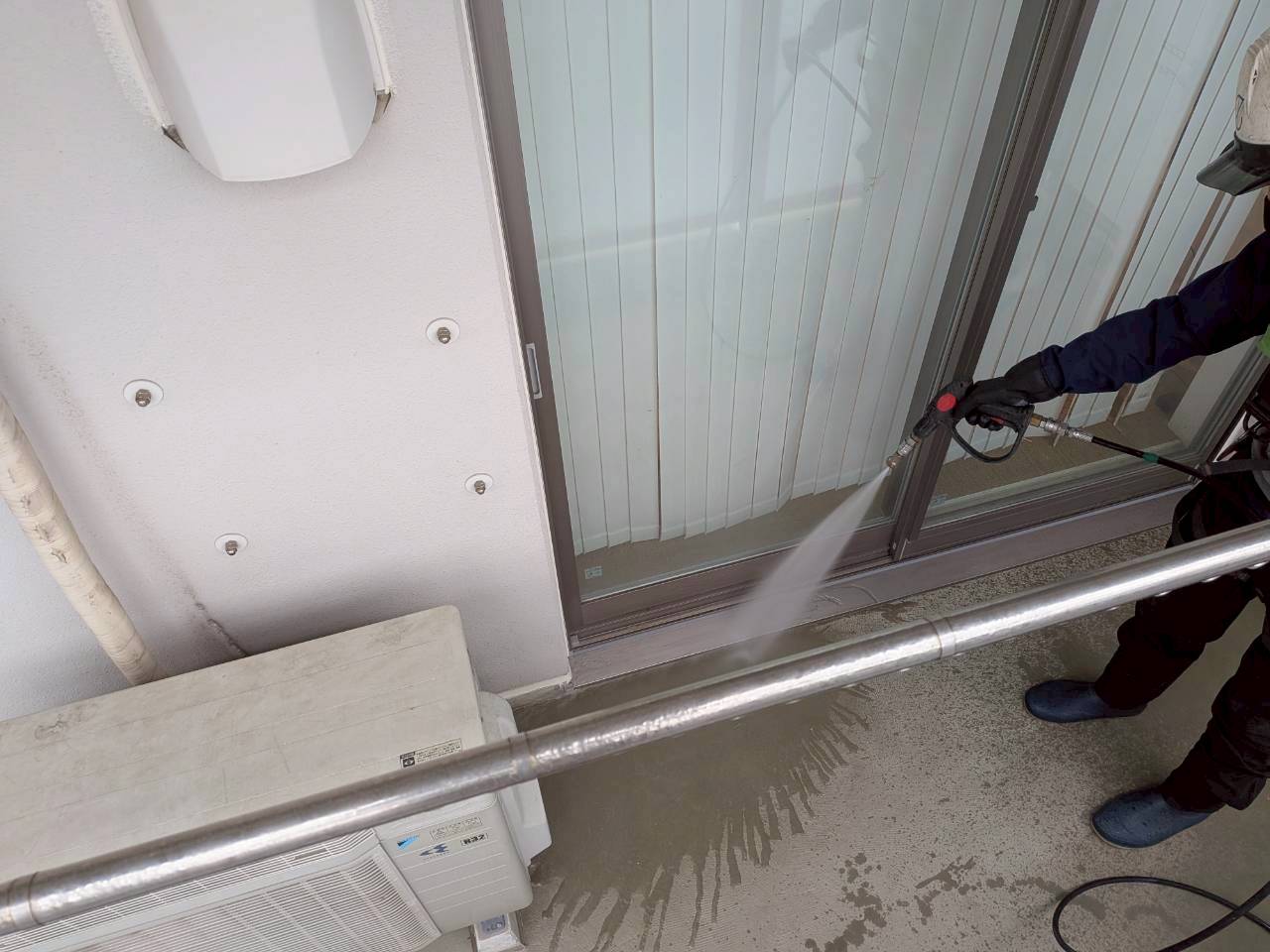 3月10日 (火) 作業状況 2026.03.11 目次 止水工事洗浄工事3月11日 (水) 予定 止水工事 手摺根本の止水工事 バルコニー等の手摺の支柱にドリルで穴をあけ止水材(グラウド材)を充填し、万が一手摺内に雨水が入っても穴から雨水が出て支柱から躯体に雨が侵入するの防ぐ工事になります。 止水材は硬化するとカチカチまで固くなる止水材料になります。 洗浄工事 B棟6号室~8号室のバルコニー、サービスバルコニーの洗浄をしました。 洗浄後は塗装工事→防水工事→長尺工事の順に作業が進んでいきます。 3月11日 (水) 予定 ・タイル洗浄工事 ・止水工事 ・防水工事 ・塗装工事
