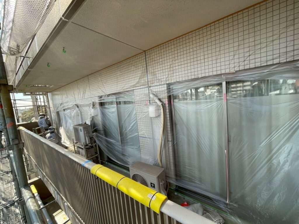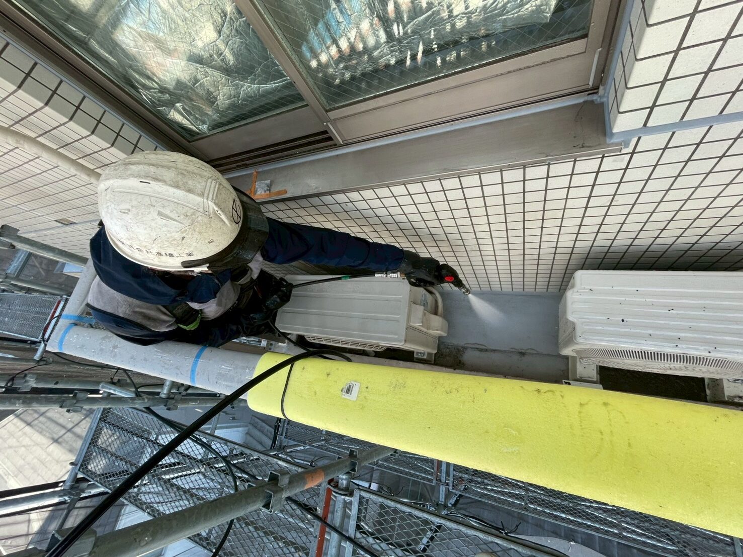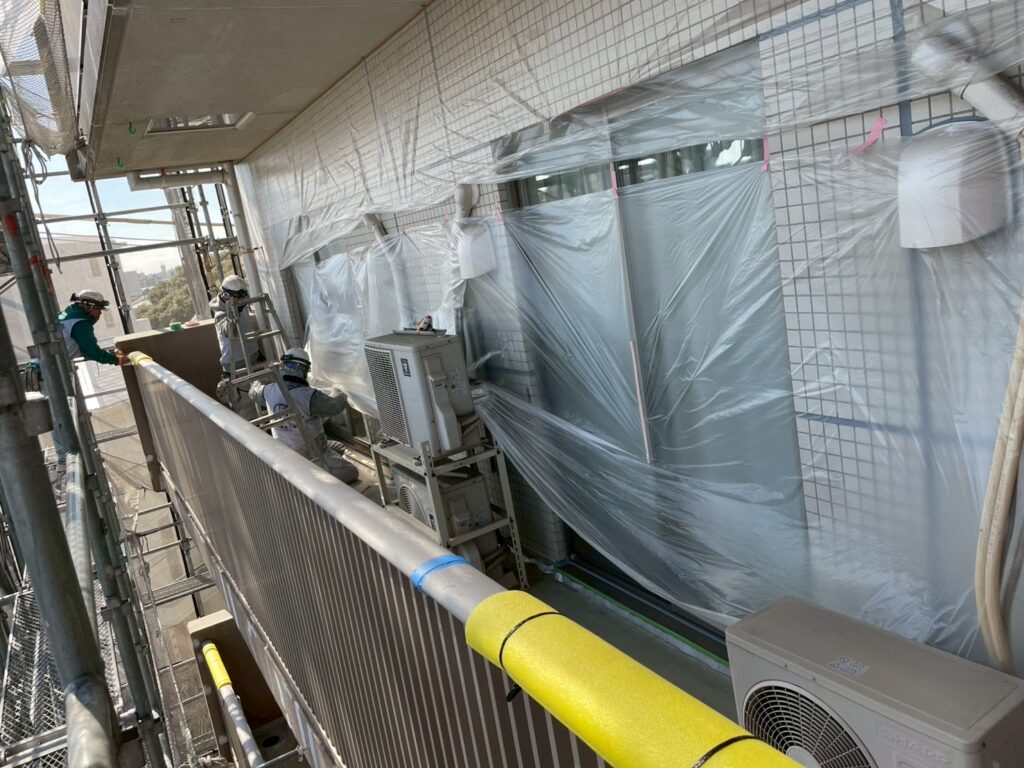 3月11日 (水) 作業状況 2026.03.17 目次 塗装工事洗浄工事3月12日 (木) 予定 塗装工事 B棟5号室の養生と下塗り工事 バルコニーは週末に使用できない部屋を減らすために、B棟は5号室を完了してから6号室~8号室の作業をします。 洗浄工事 A棟のタイル面洗浄、サービスバルコニーの高圧洗浄工事をしました。 3日間にわたり洗浄工事のご協力ありがとうございました。 3月12日 (木) 予定 ・止水工事 ・塗装工事 ・防水工事