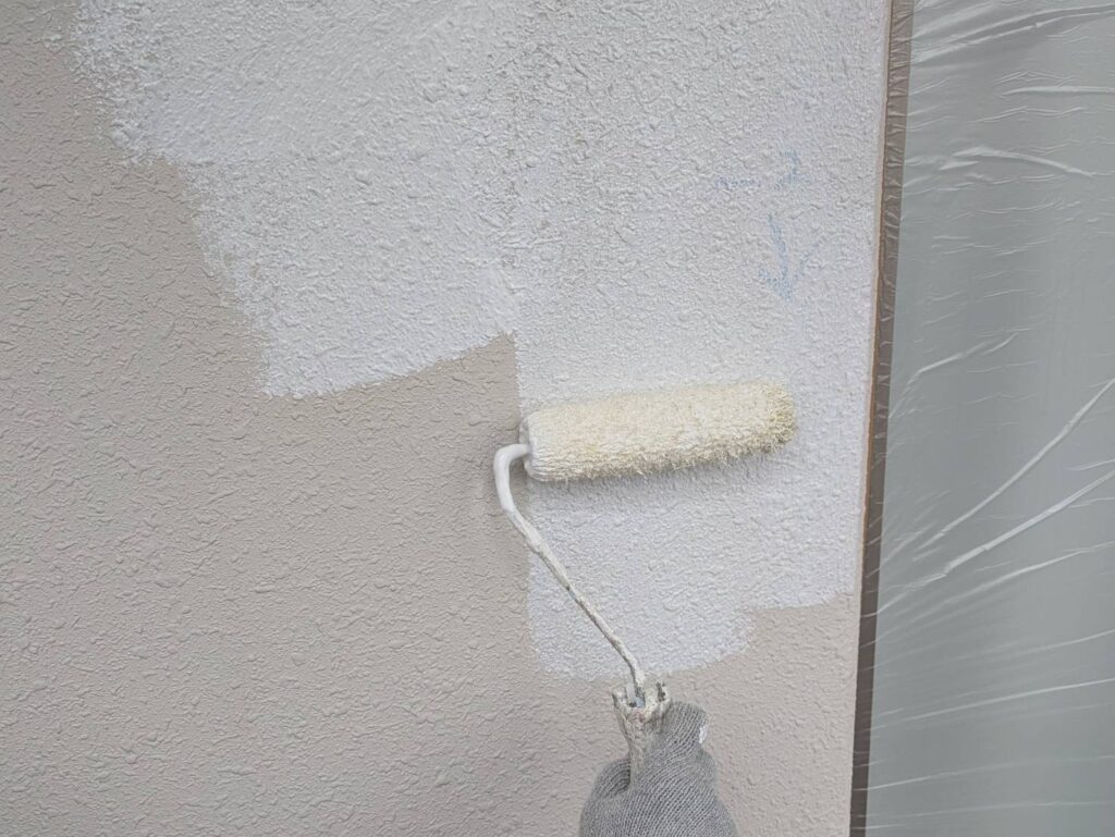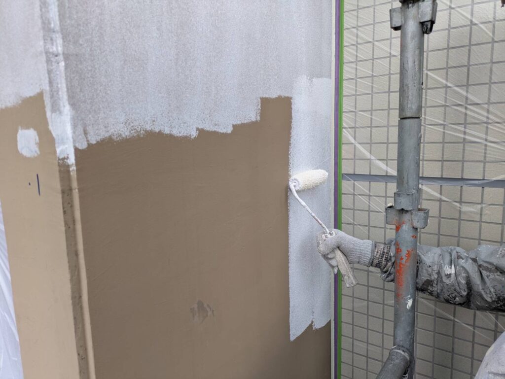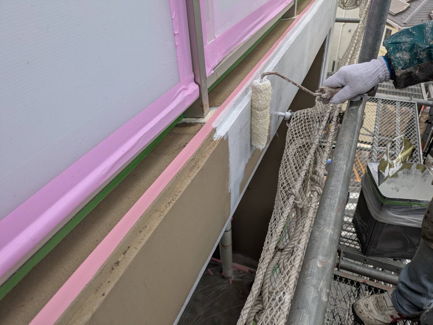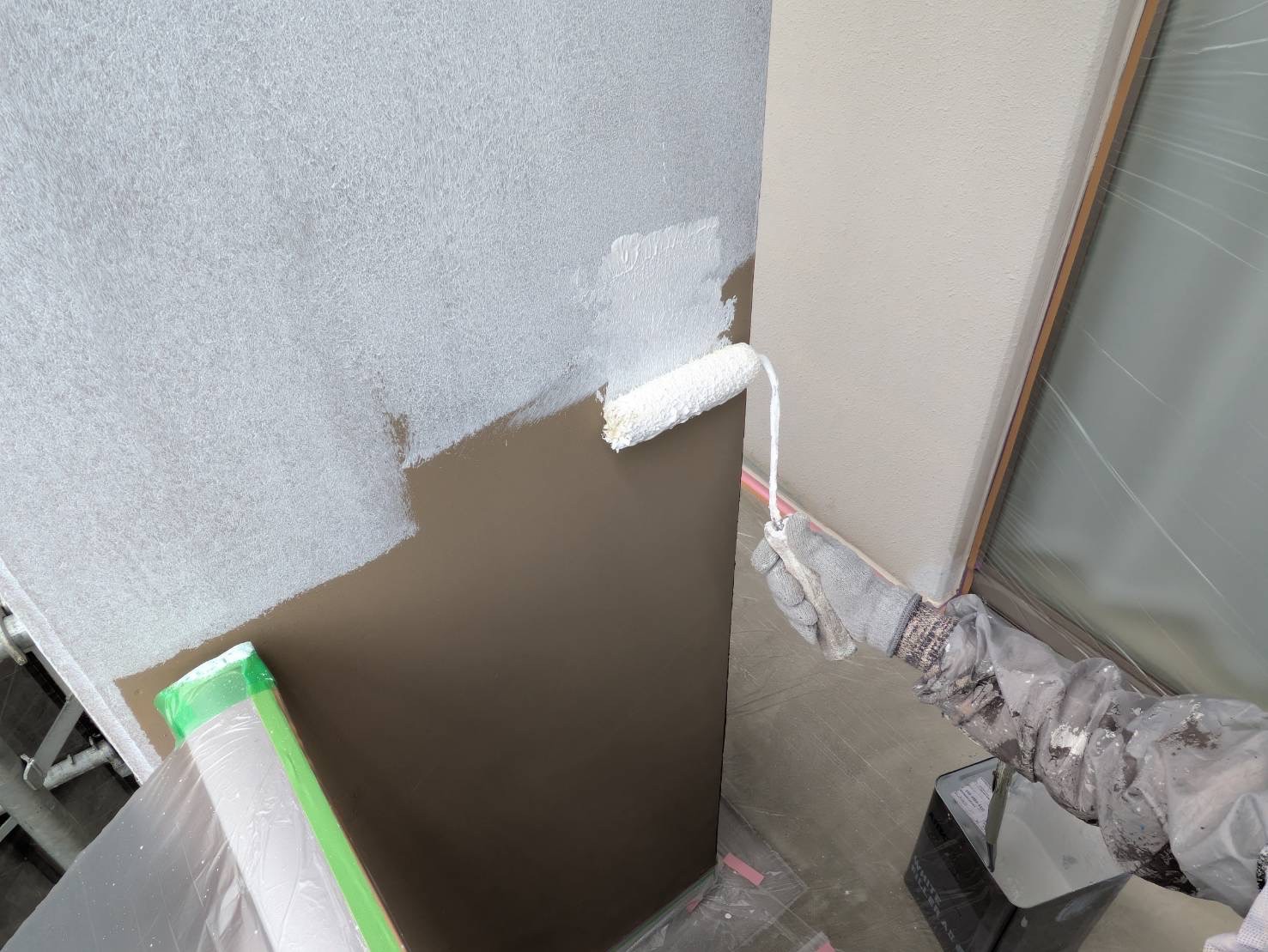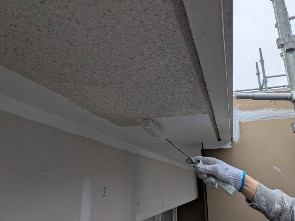 3月12日 (木) 作業状況 2026.03.182026.03.23 目次 塗装工事防水工事3月13日 (金) 予定 塗装工事 B棟バルコニーの天井の1回目の塗装、外壁の下塗り塗装をしました。 B棟のバルコニーの外壁、内壁の塗装色は4色あり(茶・ベージュ・赤・白)になります。 防水工事 A棟バルコニーのトップコート塗布をおこないました。 トップコートは紫外線からウレタン防水の塗膜を守り寒暖差、雨水から防水層を保護する役割をします。 3月13日 (金) 予定 ・タイル張り工事 ・塗装工事 ・防水工事