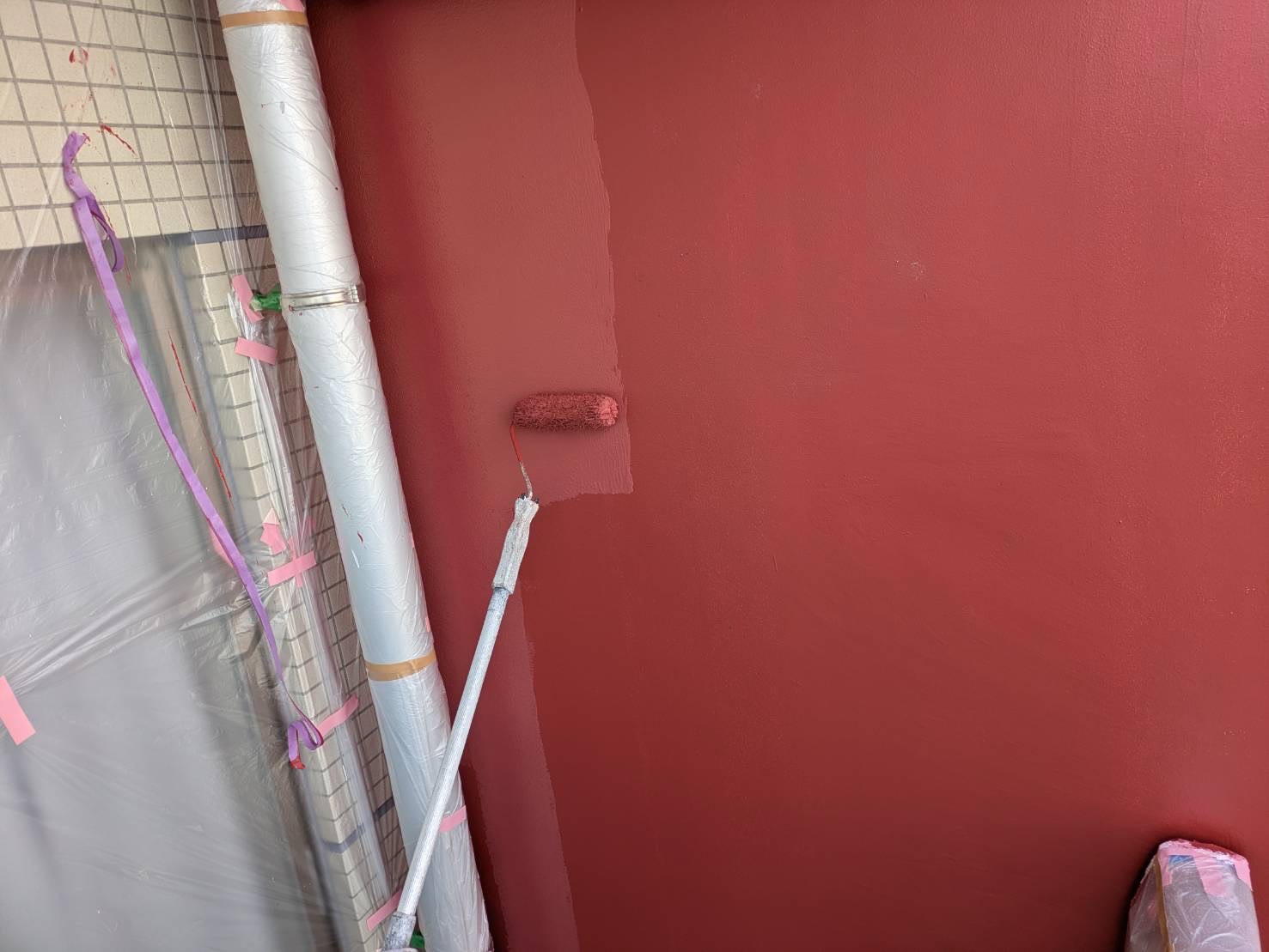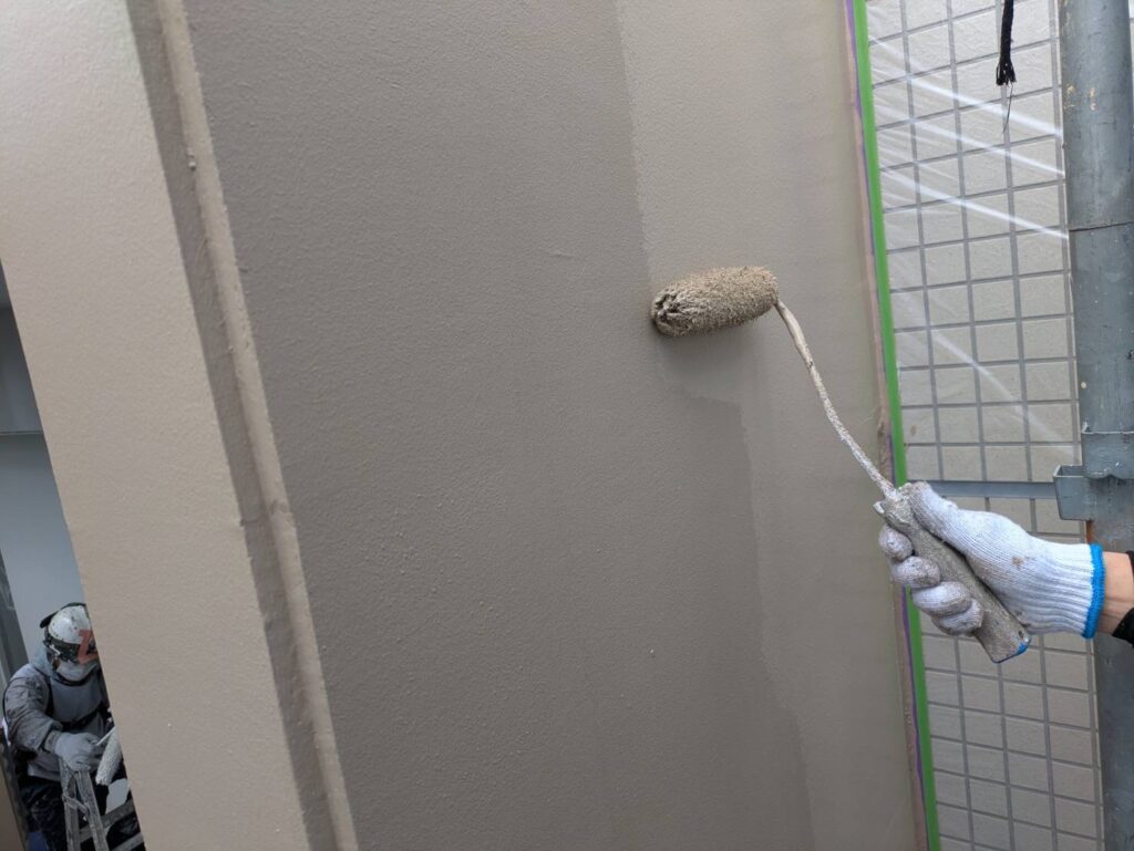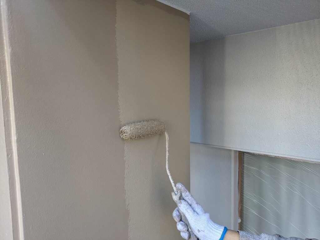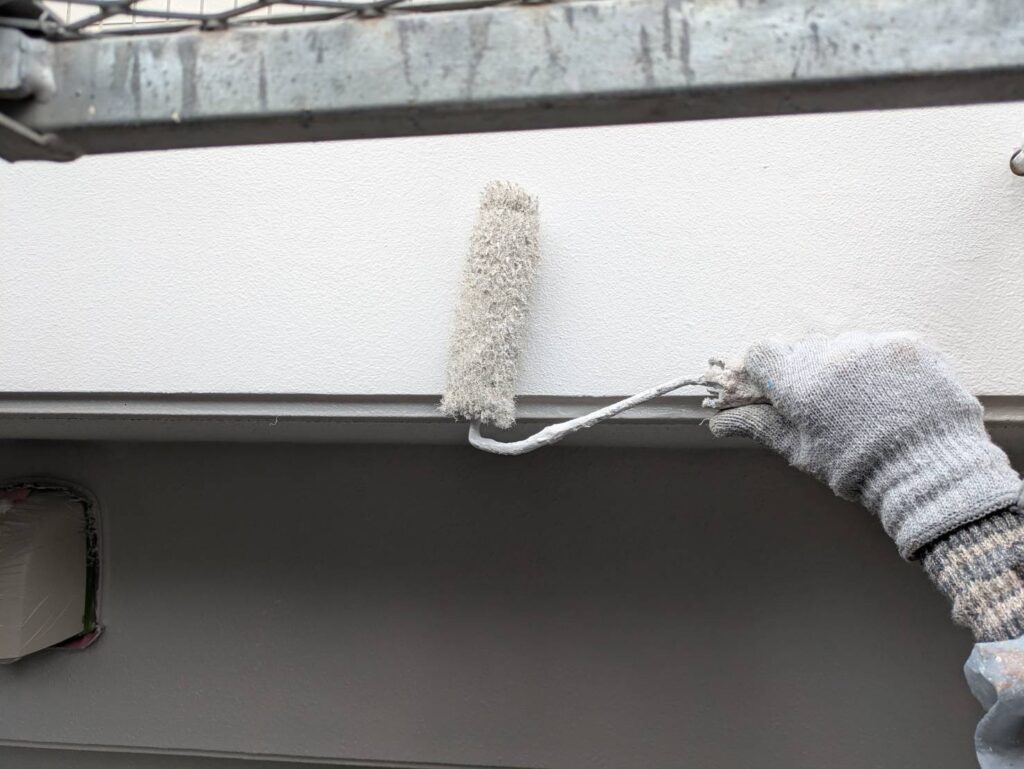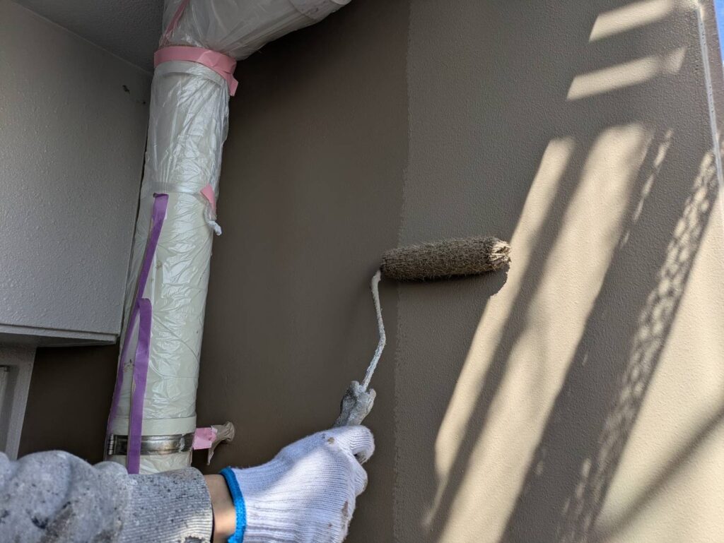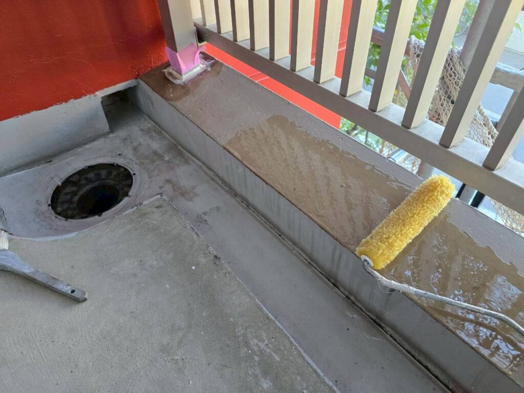 3月16日 (月) 作業状況 2026.03.23 目次 塗装工事防水工事3月17日 (火) 予定 塗装工事 B棟5号室バルコニー内の上塗り塗装工事をしました。 白系の壁、赤系の壁、茶系の壁の上塗りをしました。 下塗り(白色)→中塗り→上塗りの3回塗りの工程になります。 若干中塗りの色と違いますが、乾いて硬化すると中塗り塗装の色近づき艶が増します。 防水工事 5号室のバルコニーのプライマー塗布をおこないました。 ケレン(やすり等によりデコボコを平滑かし下地調整)→清掃→プライマーになります。 3月17日 (火) 予定 ・塗装工事 ・防水工事