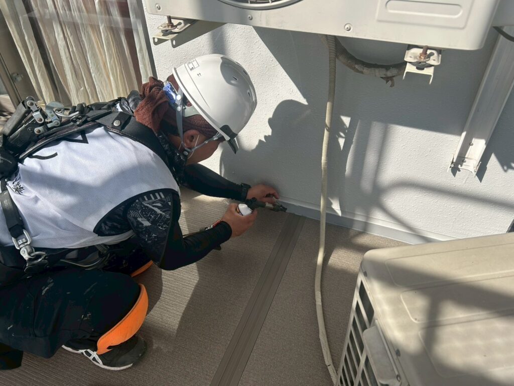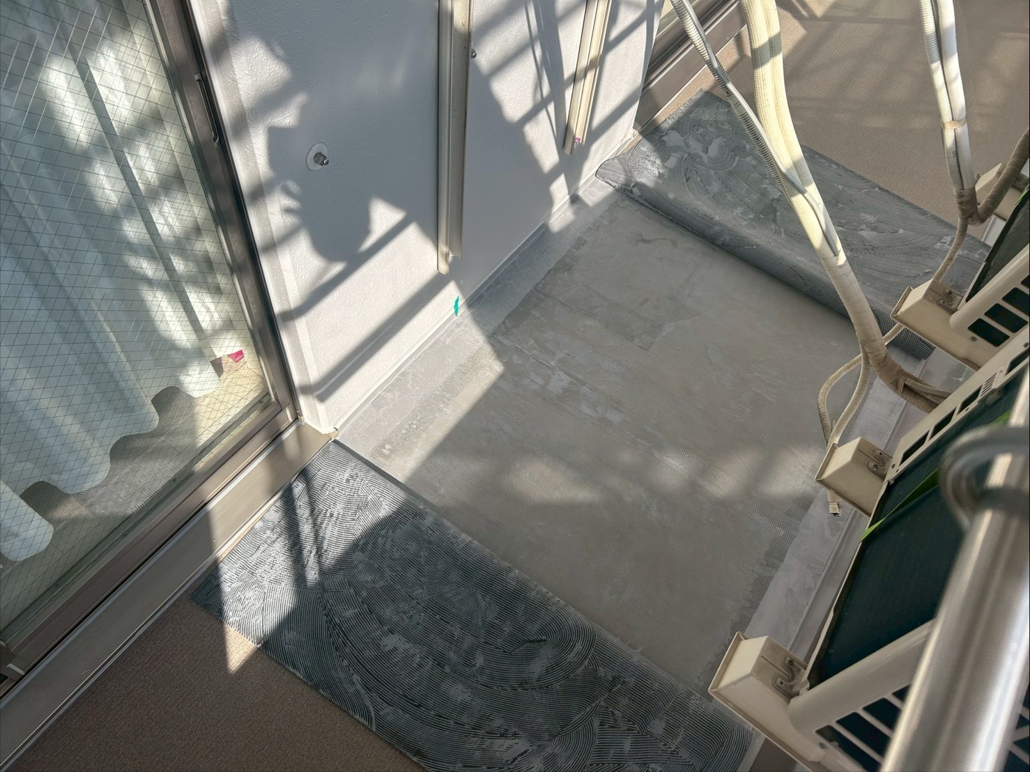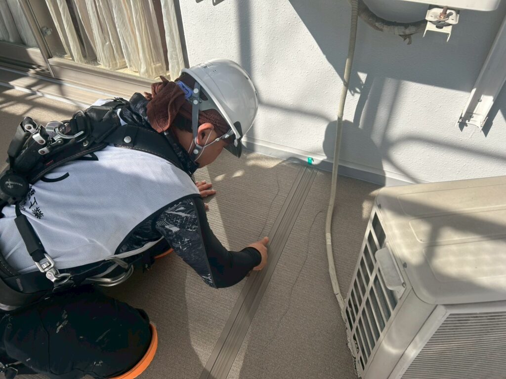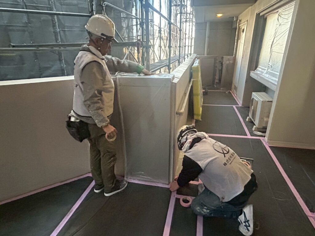 3月23日 (月) 作業状況 2026.03.30 目次 長尺工事塗装工事3月24日 (火) 予定 長尺工事 A棟バルコニーの長尺張り工事をしました。 新しい張りたての長尺は約1か月ほどは帳面張力が強く雨水が残る可能性があります。 また重みには強いですが、尖ったものには弱いので傷をつけないよう気を付けてください。 塗装工事 A棟共用廊下の養生作業、肌合わせ塗装をしました。 共用廊下、階段の塗装を本日23日(月)~1週間の予定で施工をしていきます。 3月24日 (火) 予定 ・塗装工事 ・防水工事