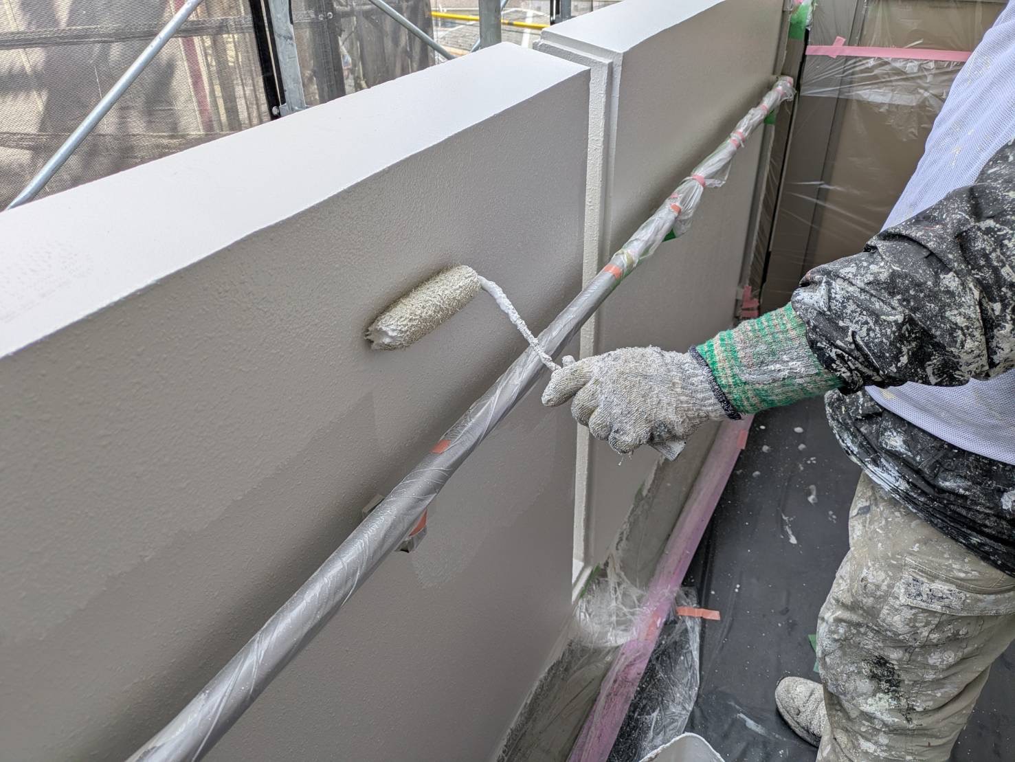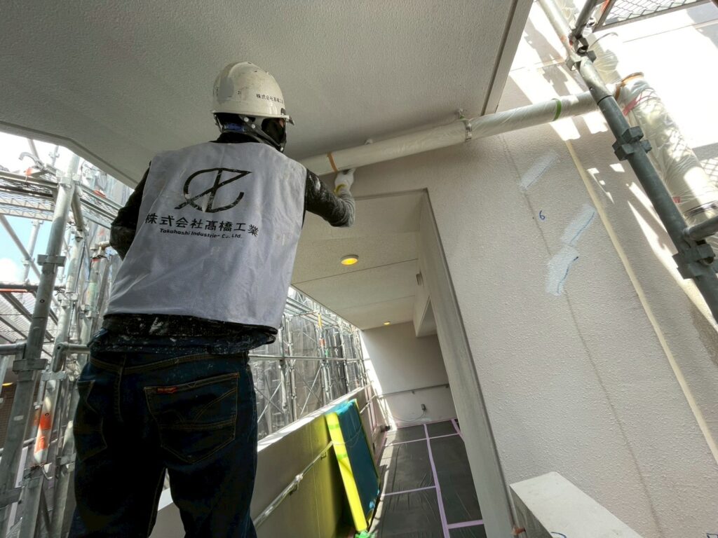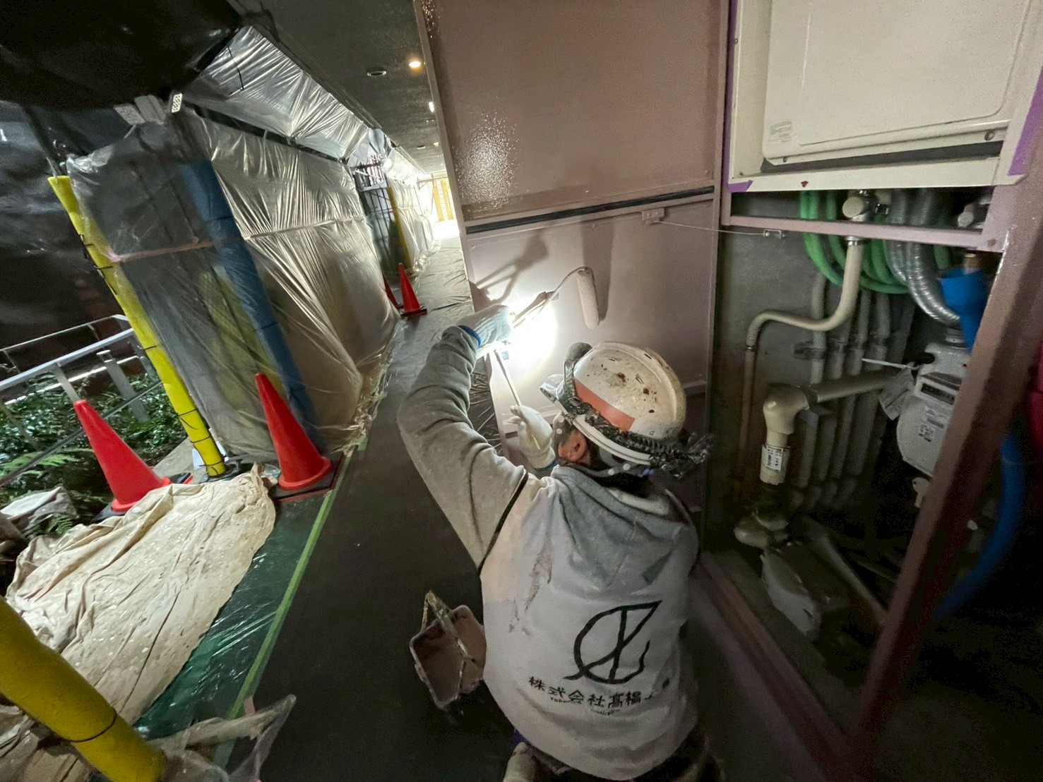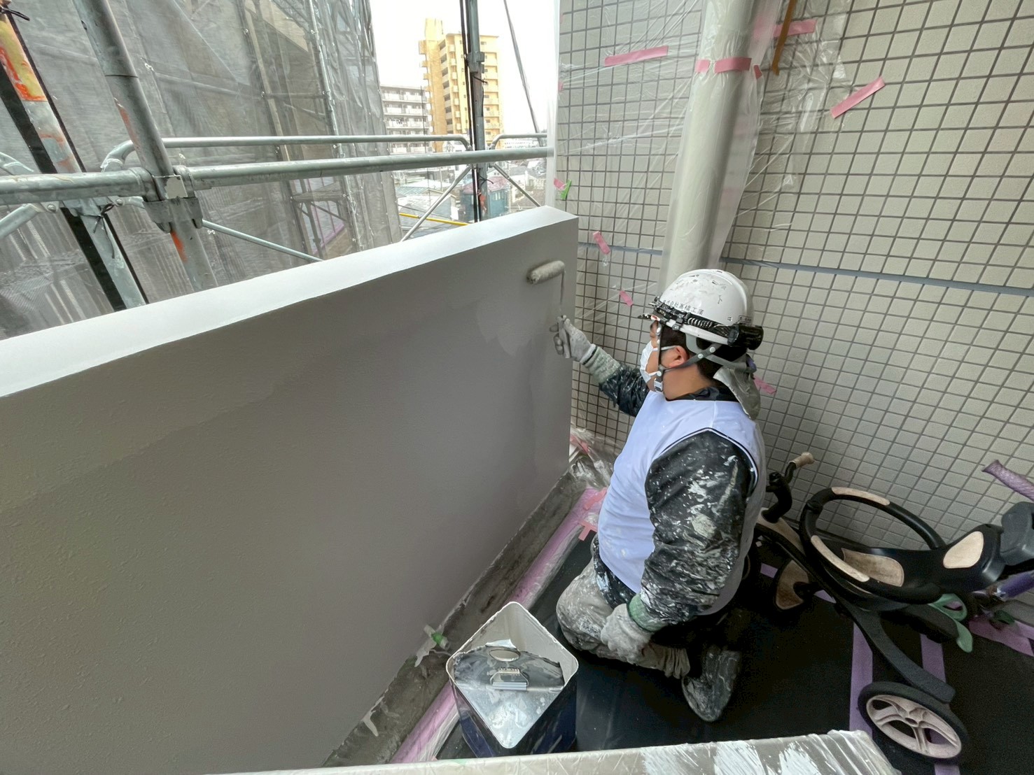 3月28日 (土) 作業状況 2026.03.31 目次 塗装工事防水工事3月30日 (月) 予定 塗装工事 土曜日作業のご協力ありがとうございました。 A棟共用廊下の塗装工事は内壁の上塗り塗装、鉄部の上塗り塗装をしました。 次回3月30日(月)にA棟玄関枠の塗装工事をします。 防水工事 A棟サービスバルコニー、庇のウレタン防水1層目塗布をしました。 次回ウレタン2層目塗布を予定しております。 3月30日 (月) 予定 ・塗装工事 ・防水工事 ・長尺工事