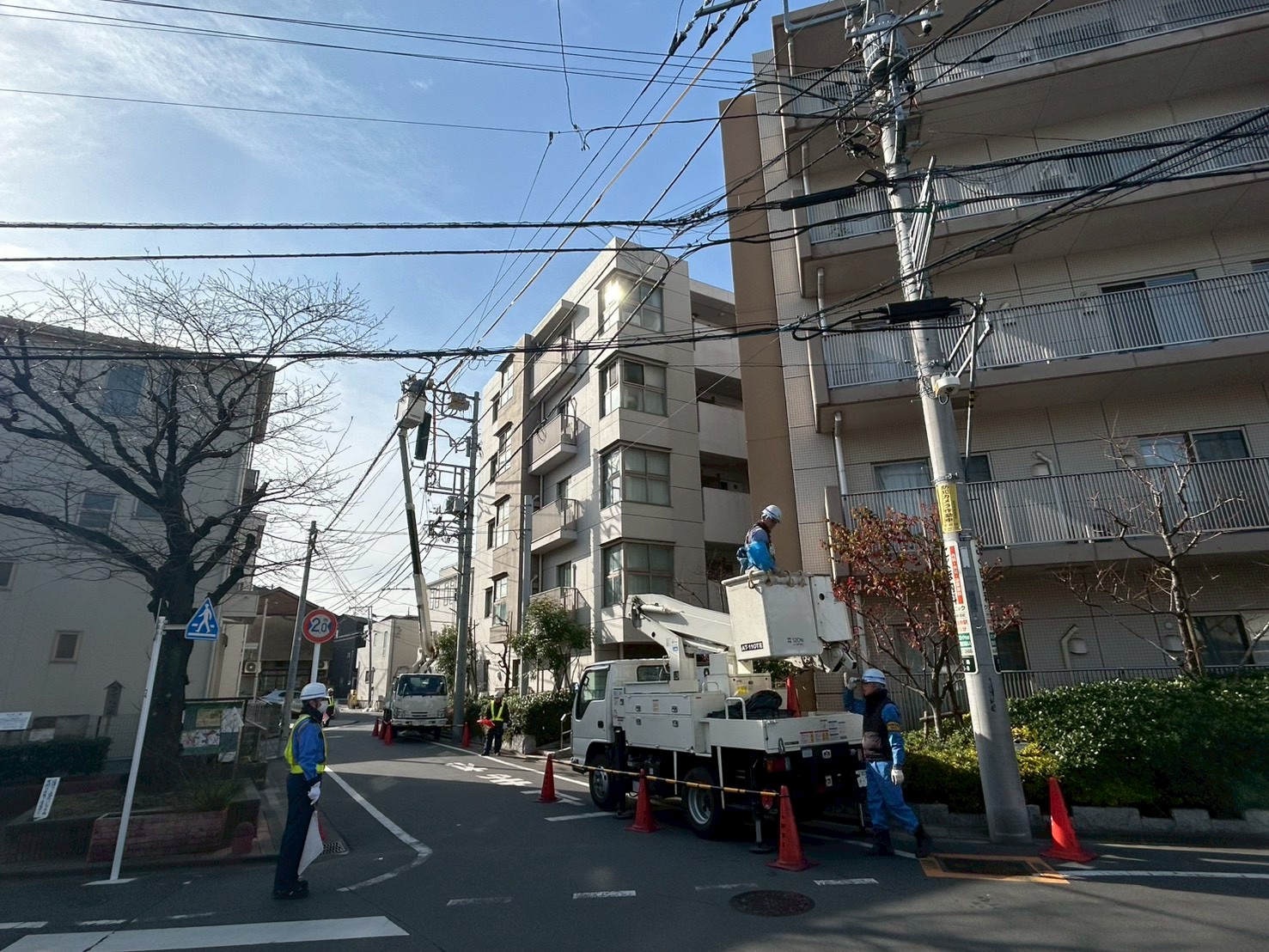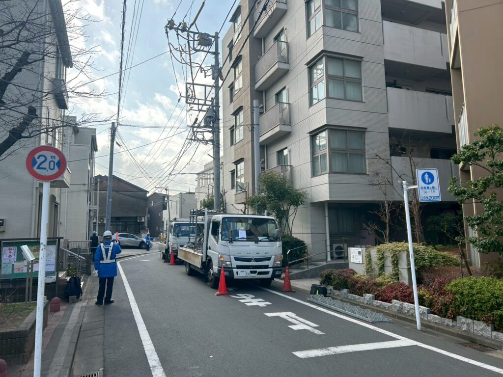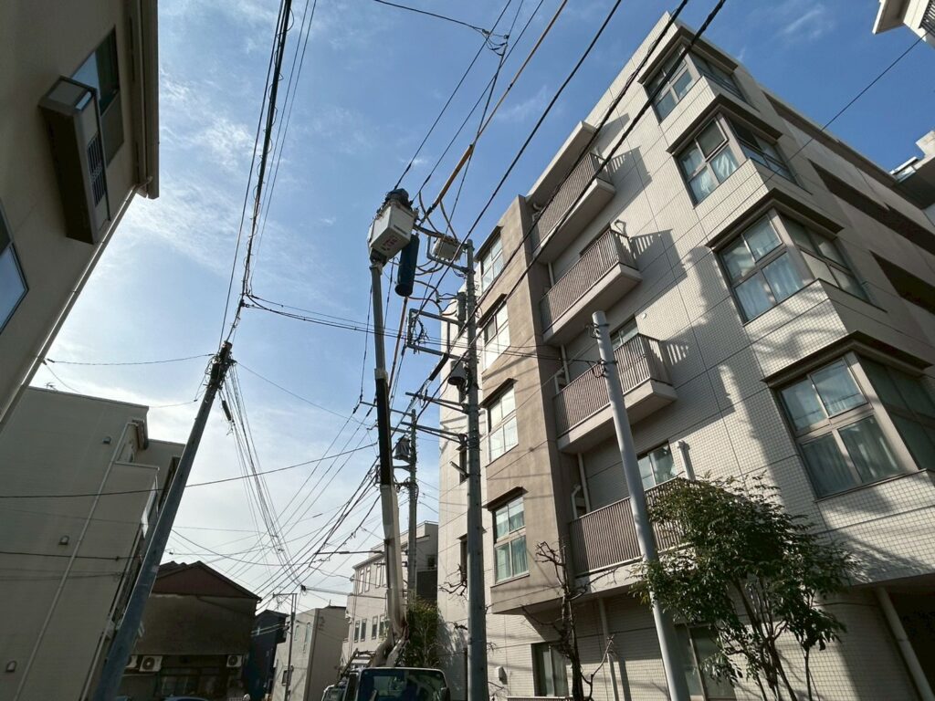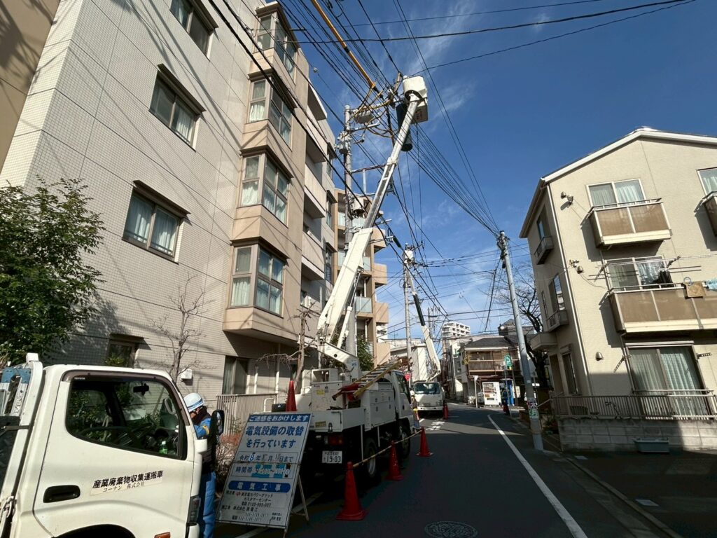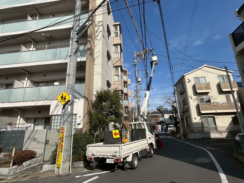 関電工の作業員による防護管の設置をおこないました。足場組立前に高圧線の防護をいたしました。