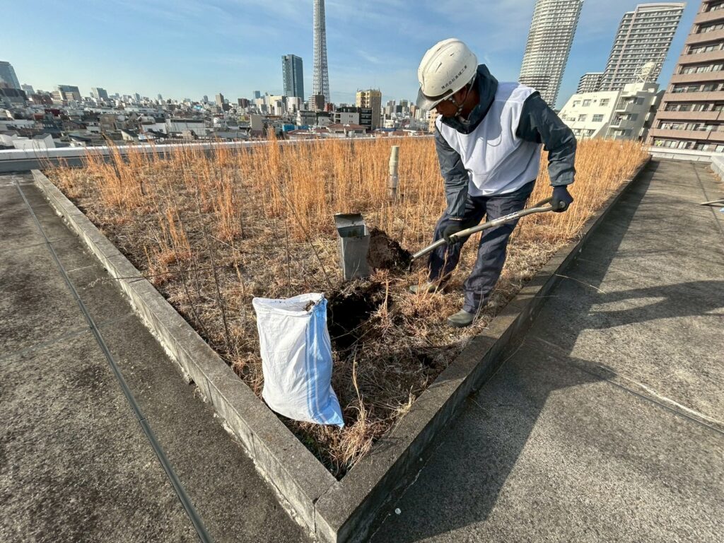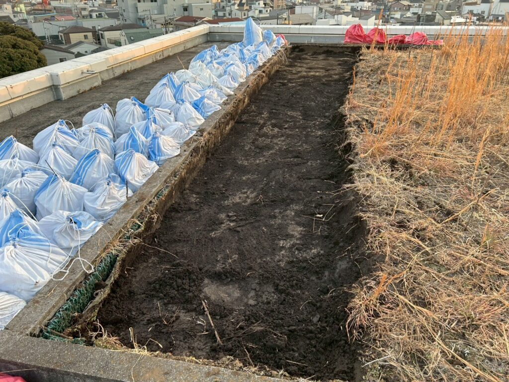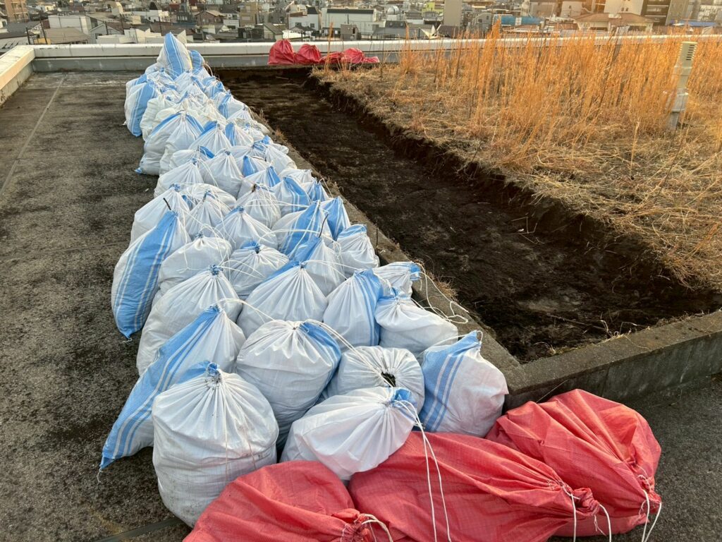 屋上緑地の撤去に伴い、土をガラ袋にて撤去を開始しました。