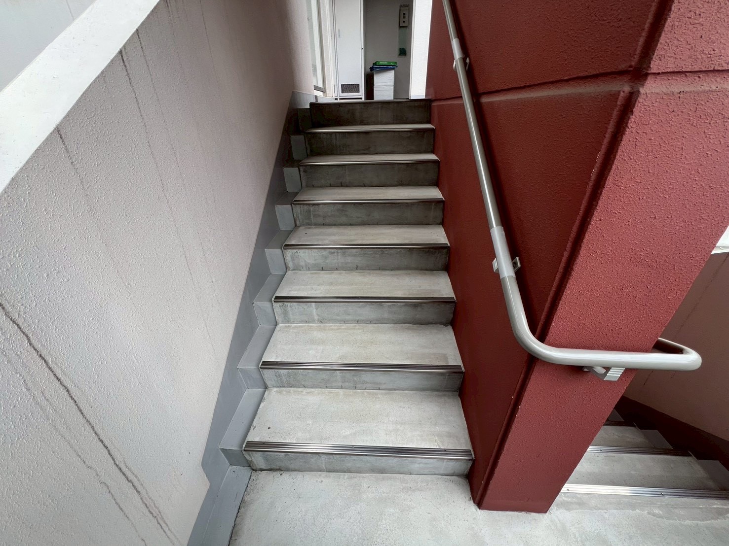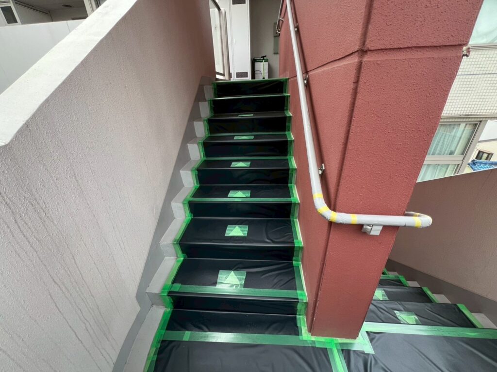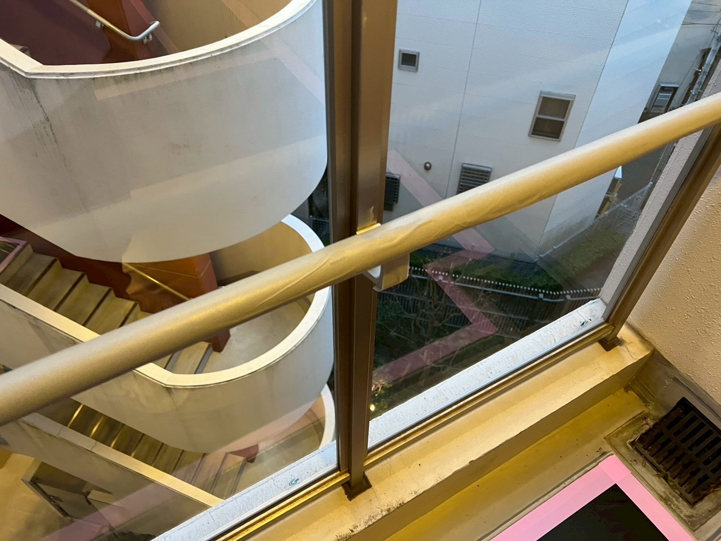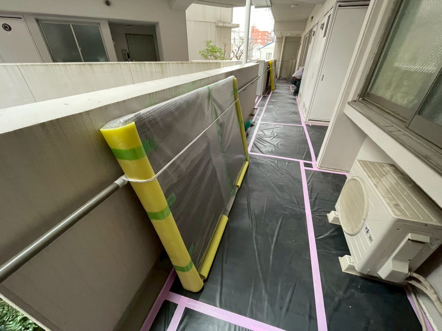 A棟共用部、床の養生、手摺の養生をおこないました。