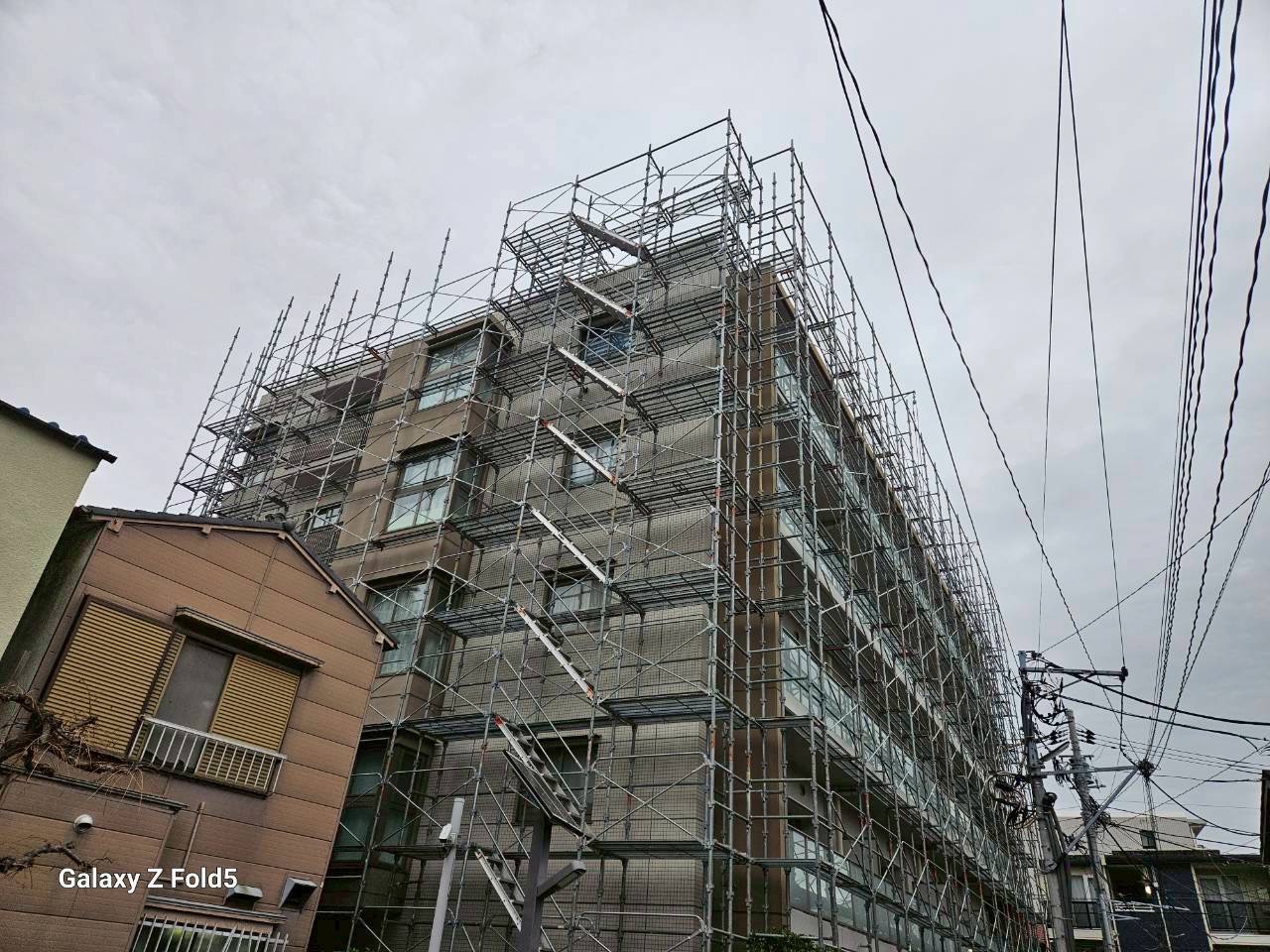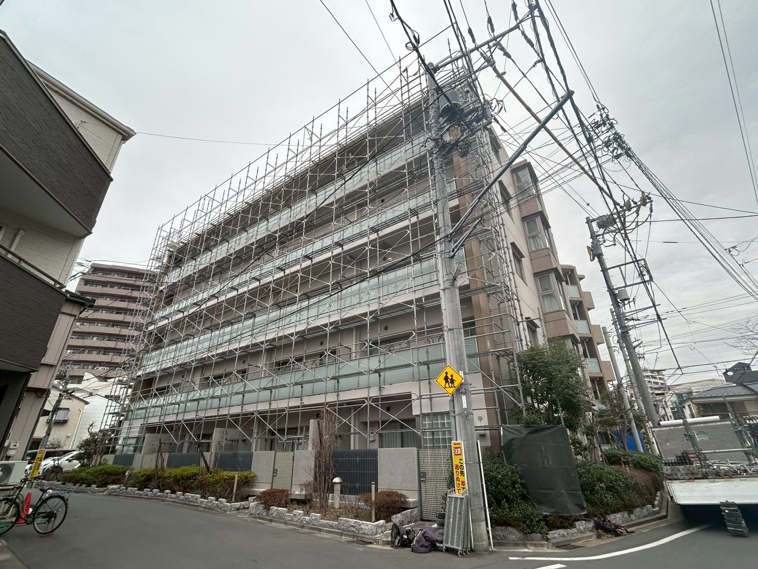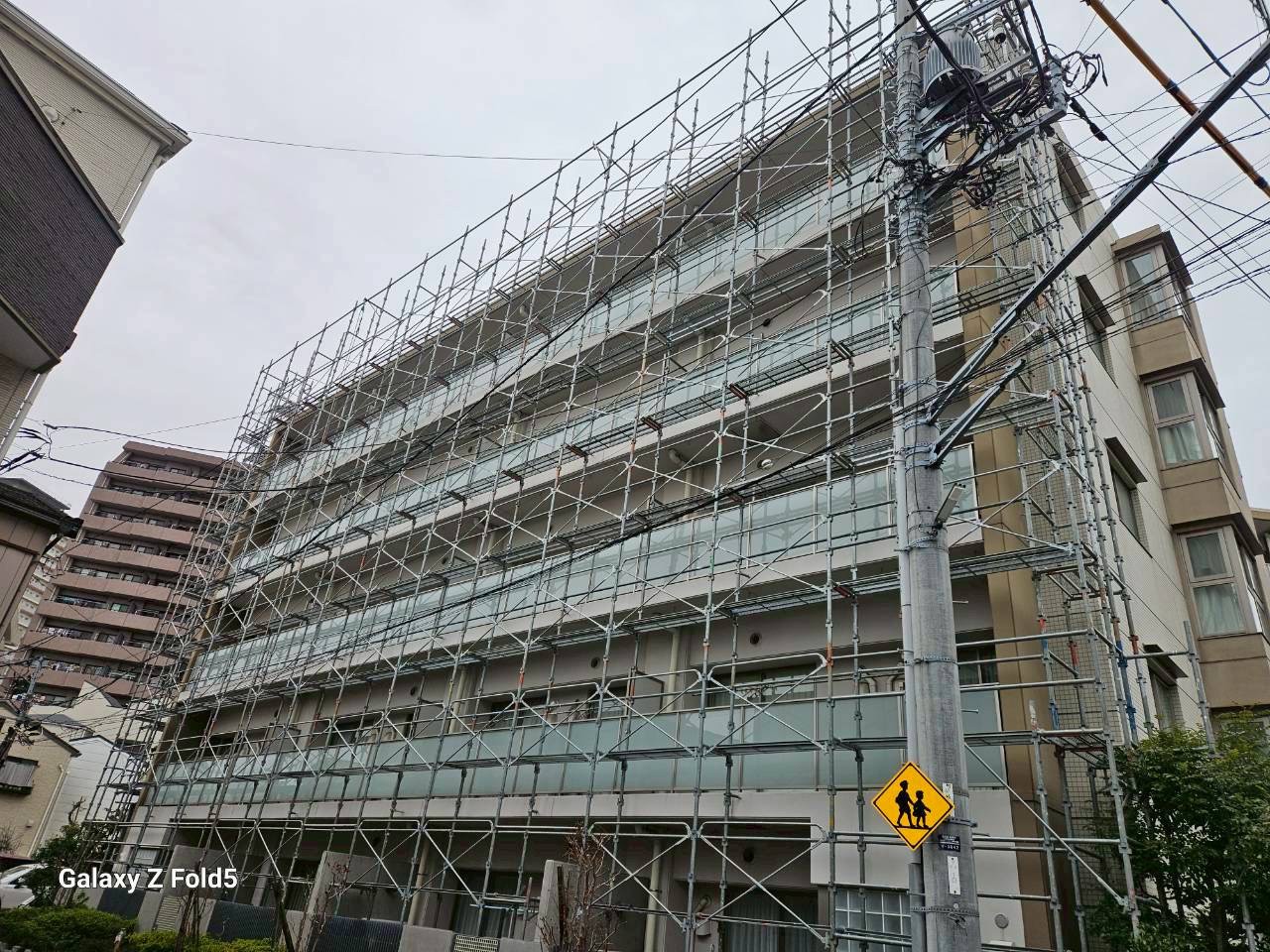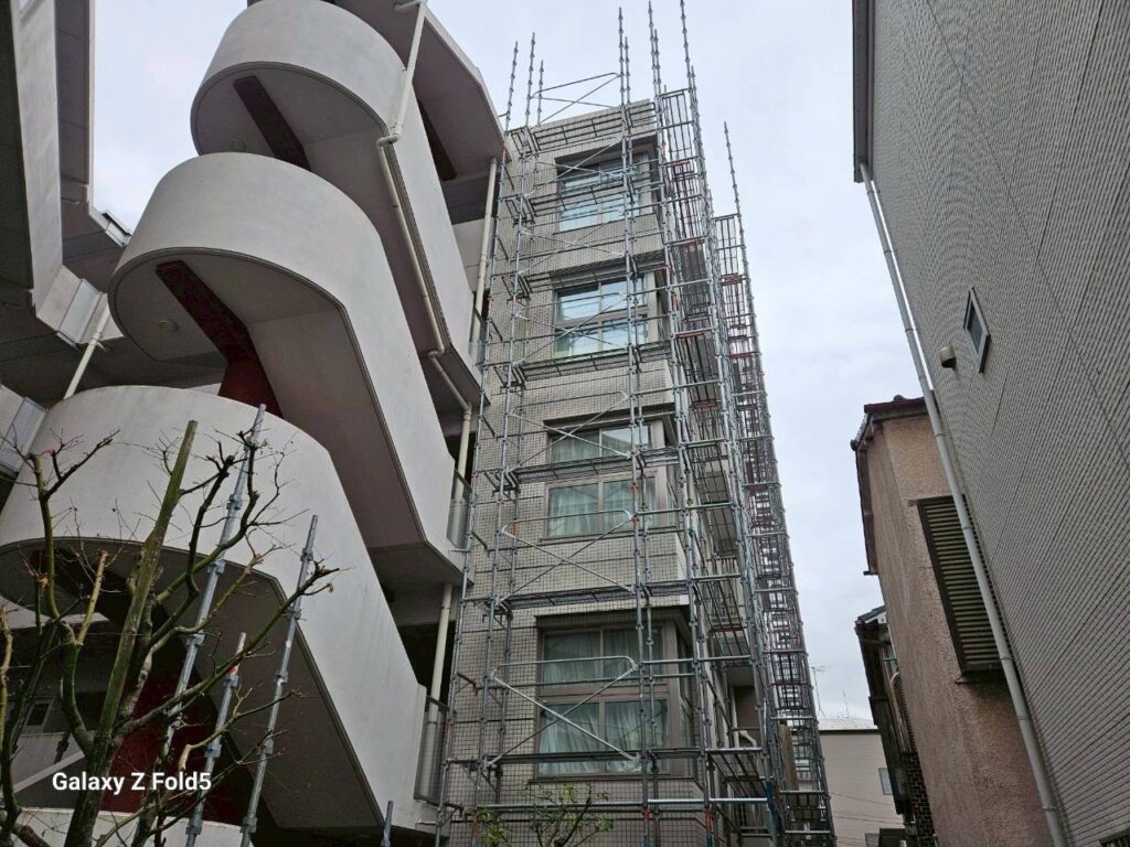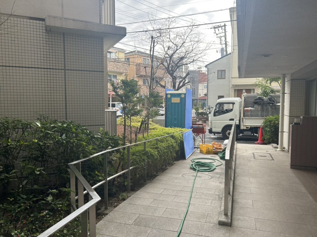 1階周りは足場、水栓設備により、狭く通行止めの箇所もあるので通行の際は注意して下さい。