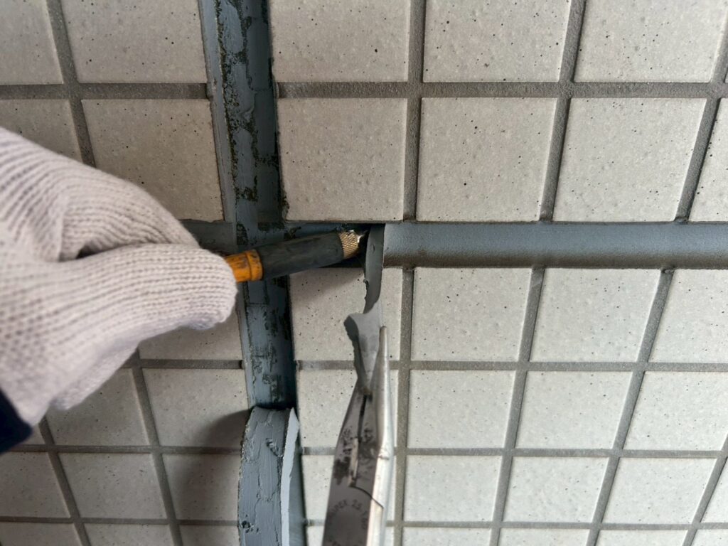 既存のシーリング撤去が終わりしだい、タイル目地、手摺根本、塗装面目地に新しいシーリングを打ち直していきます。