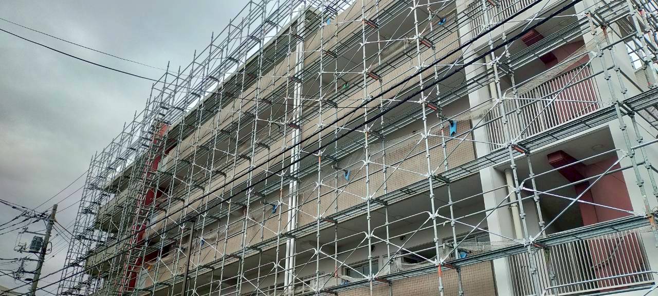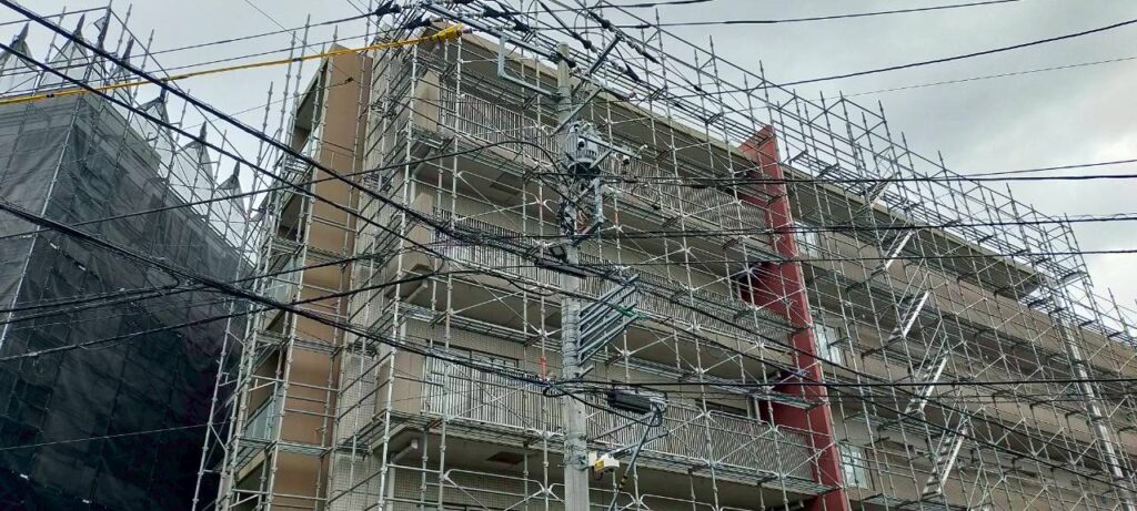 足場組立工事はB棟が7割立上りました。細かな手直し、落下防止安全対策、黒メッシュ飛散養生等の作業を、29日(木)30日(金)におこなっていきます。