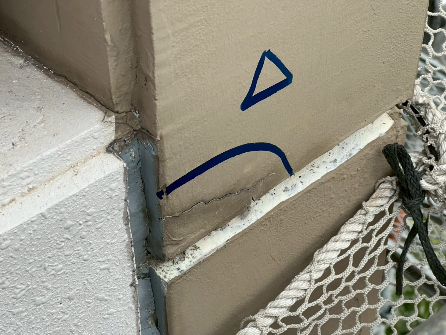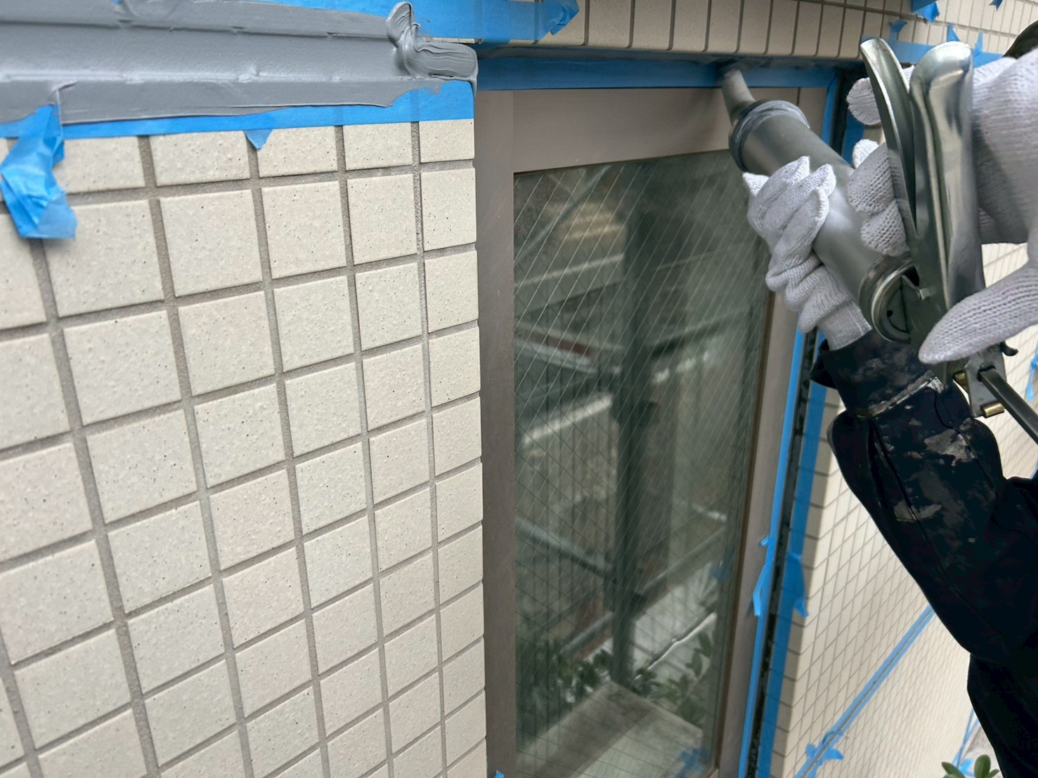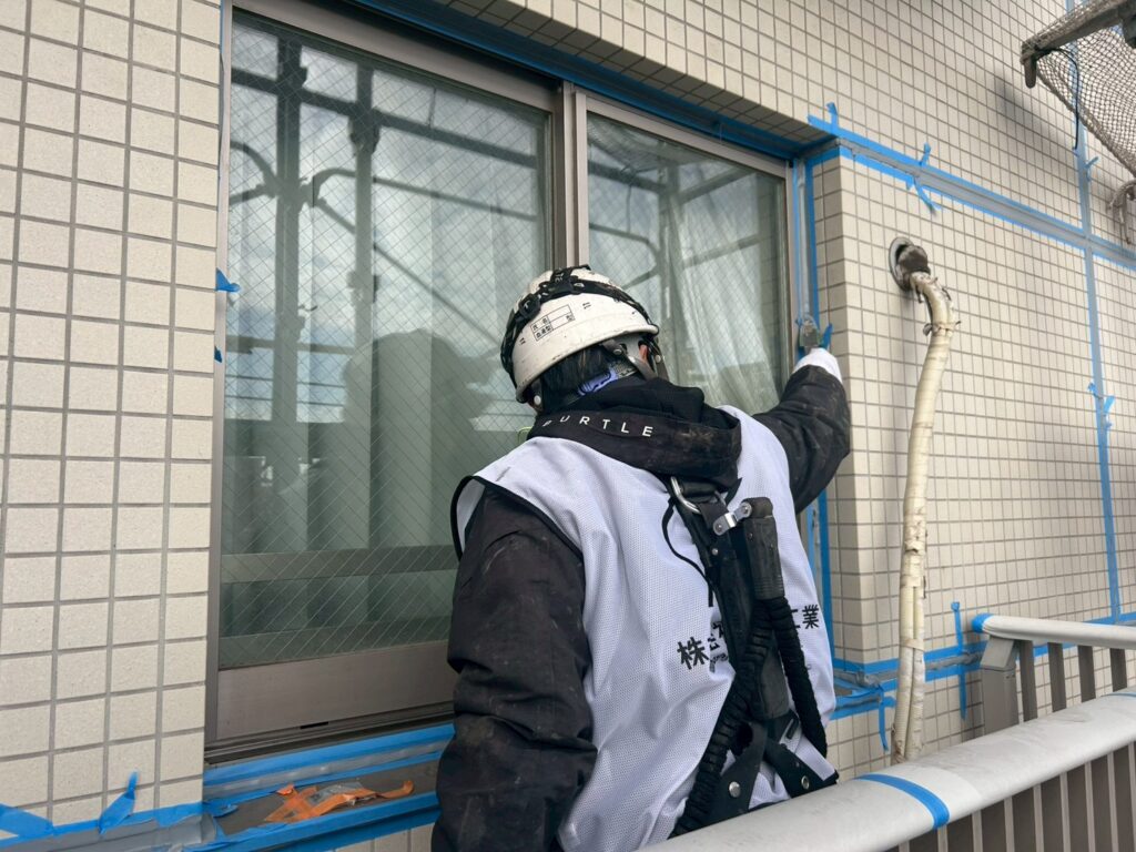 A棟外壁、バルコニー内のシーリング打ち替え工事。窓周りは触らなように開閉の際は注意して下さい。