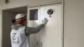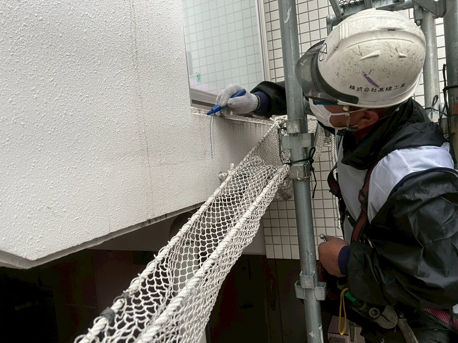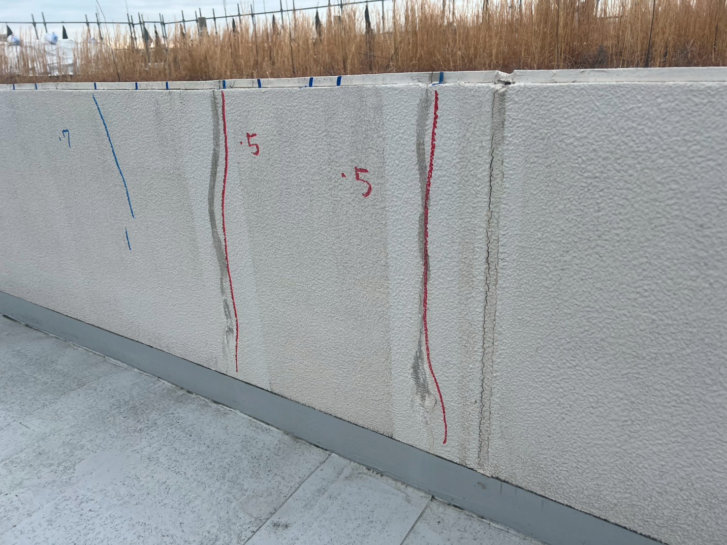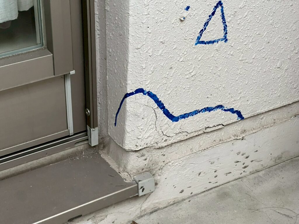 壁にできたヒビや欠損している箇所等の補修が必要な箇所にマークをつけて調査をしております。