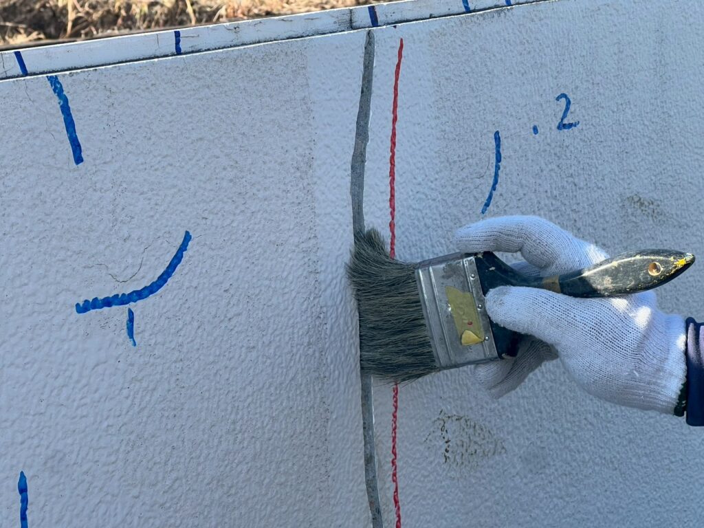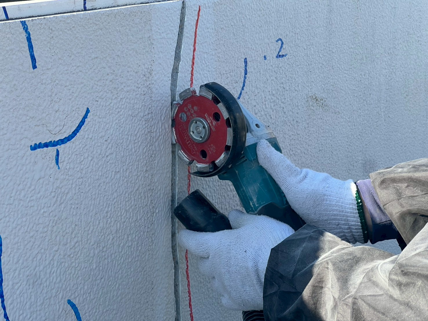 電動工具に分厚いカッターの刃で壁を削り、ヒビ箇所を広げ、ヒビに追求するシーリング材を打ち柔軟性を良くし同じ個所にヒビが入らないように補修をおこないます。