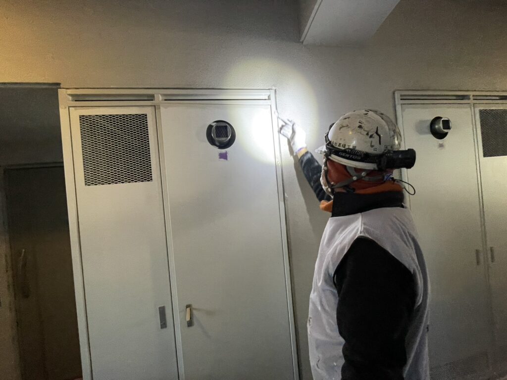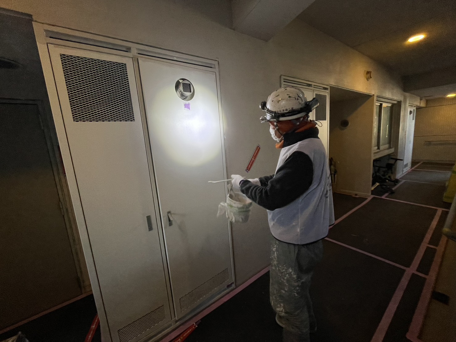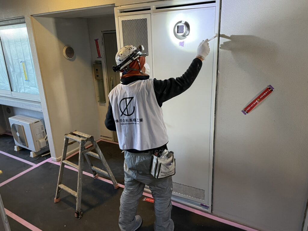A棟2階~5階の共用部のPS扉の中塗り塗装工事