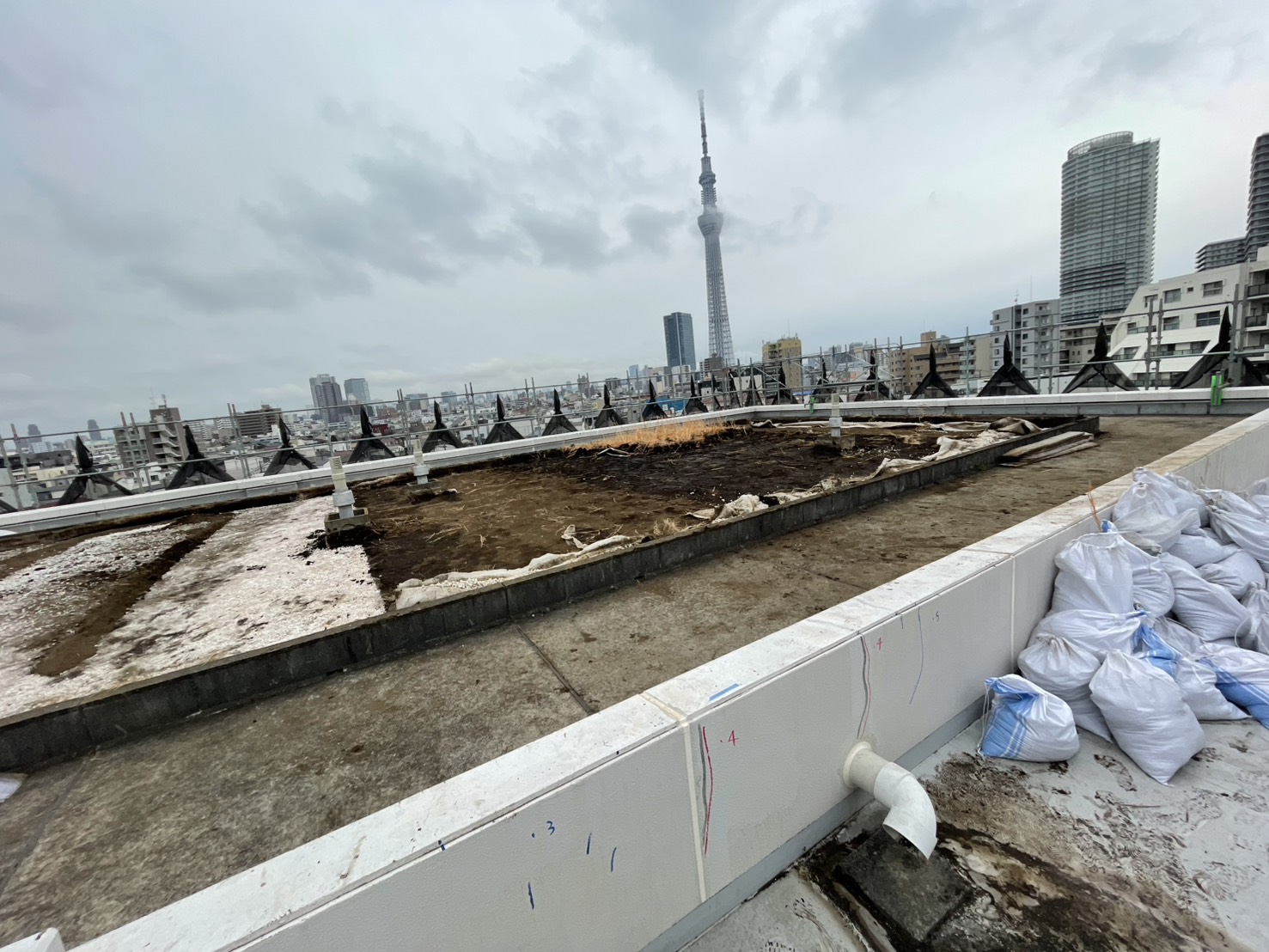 A棟屋上の緑地は土のう袋への積み込みは9割完了しました。