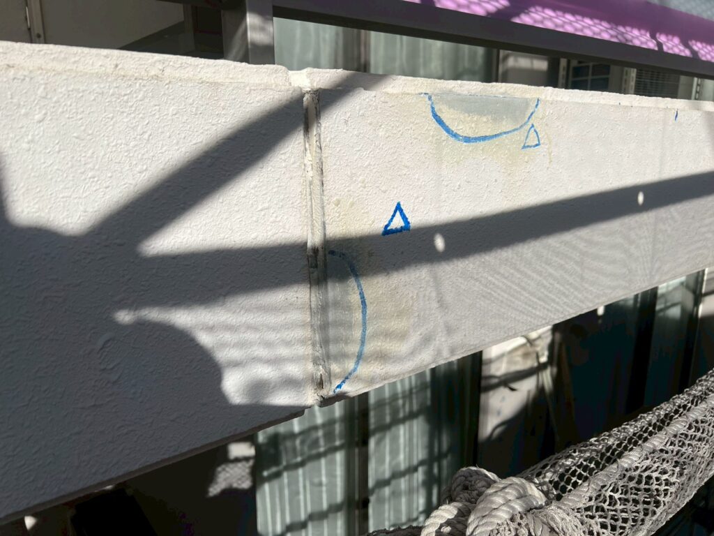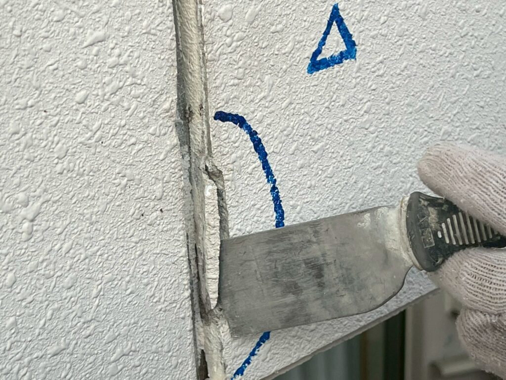 Uカット後→プライマー塗布→シーリング充填→ヘラ仕上げ→次回、モルタル整形→肌合わせ