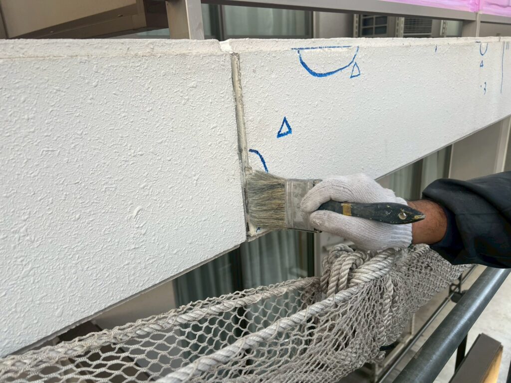 斫り→清掃→プライマー塗布→モルタル整形→ 次工程は塗装班が肌合わせ