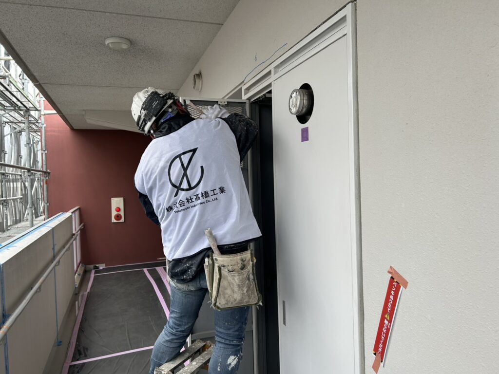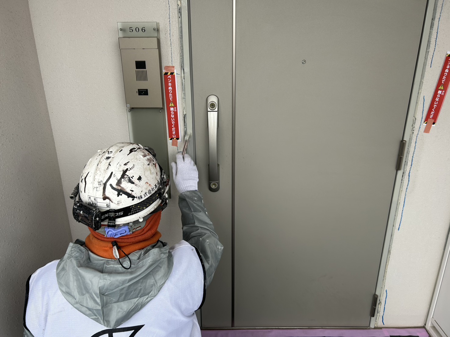 玄関ドア枠を塗装しているため出入りをする際は触らにように注意して下さい。