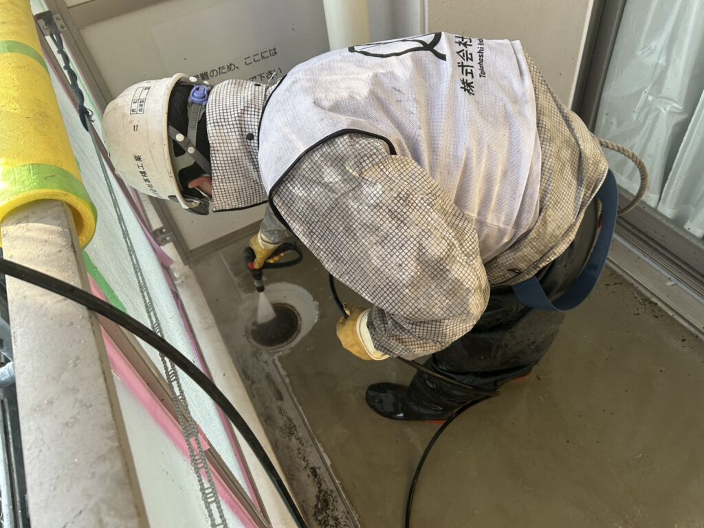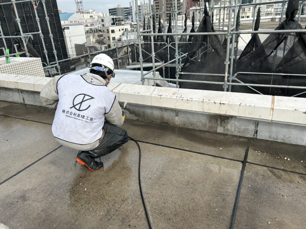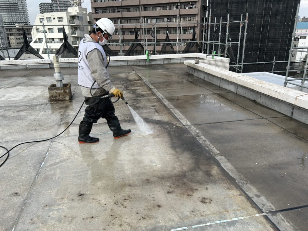 A棟屋上、バルコニーの高圧洗浄工事をしました。